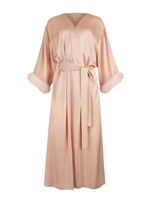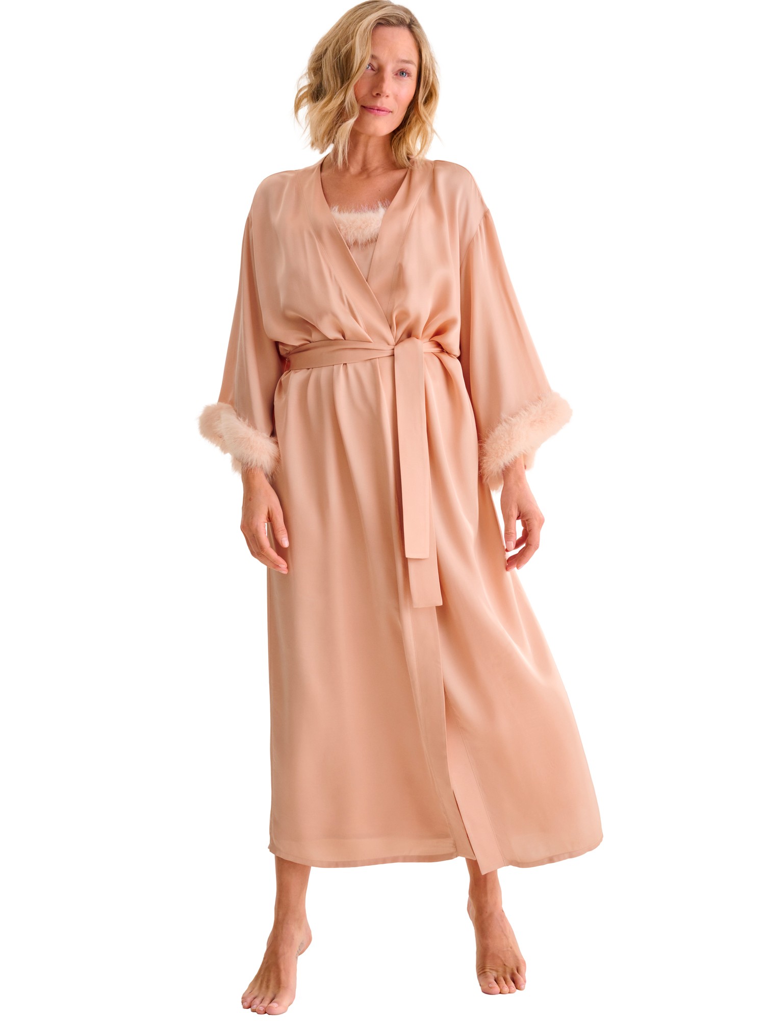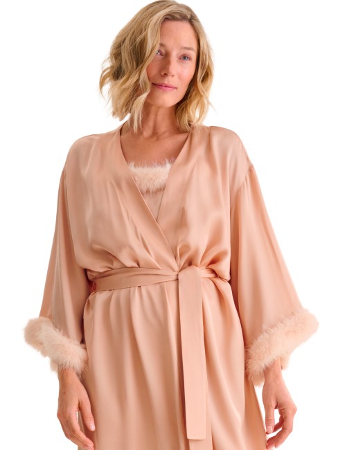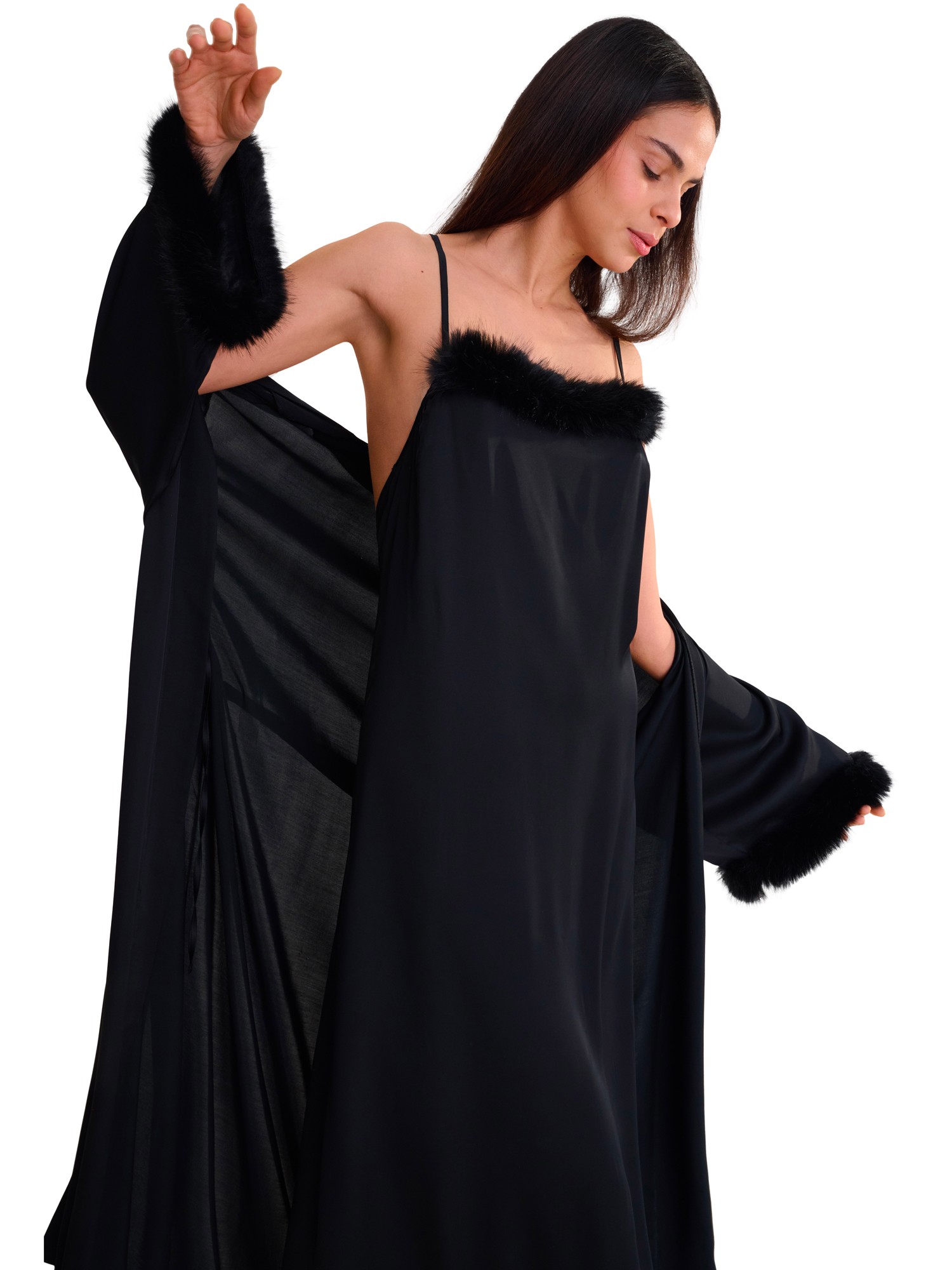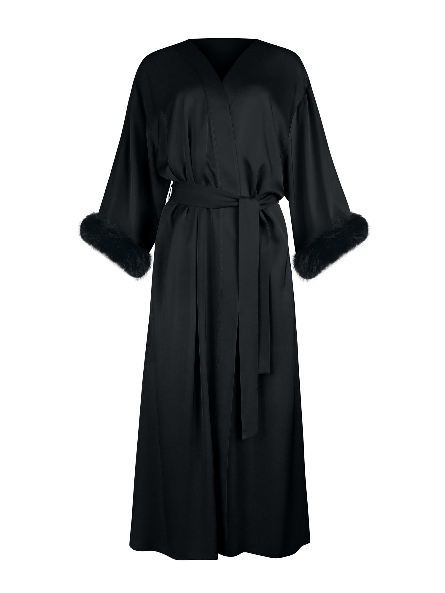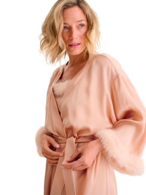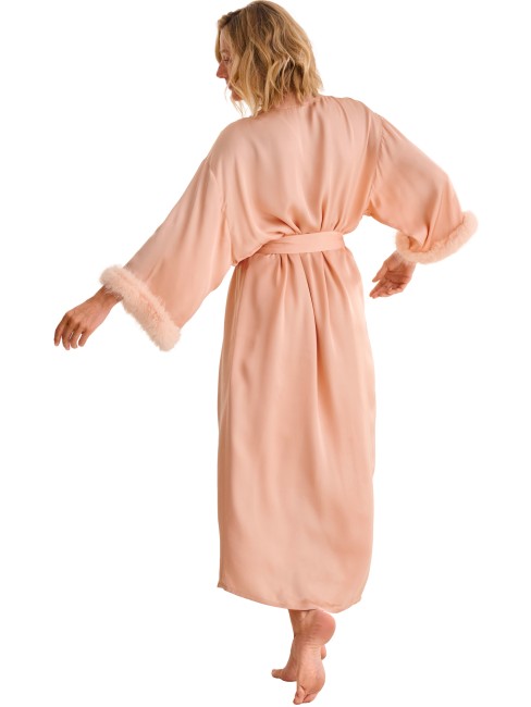Déshabillé long élégant à la coupe ample, avec des manches larges ornées d'une bande en fourrure. Encolure finie par un ourlet qui descend sur toute la longueur à l'avant. Il peut être porté ouvert, ou fermé grâce à une ceinture à nouer à la taille. Longueur environ 130cm.