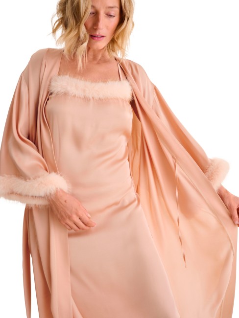 Collection de nuit confortable et sophistiquée aux lignes épurées et simples, confectionnée dans un tissu viscose légèrement brillant. Elle se distingue notamment par ses finitions en fourrure douce sur les manches et l'encolure. Le contraste entre la matière lisse et la bande duveteuse crée un look et un toucher esthétiquement attrayants.