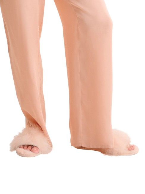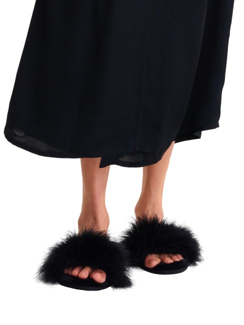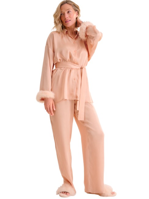 Collection de nuit confortable et sophistiquée aux lignes épurées et simples, confectionnée dans un tissu viscose légèrement brillant. Elle se distingue notamment par ses finitions en fourrure douce sur les manches et l'encolure. Le contraste entre la matière lisse et la bande duveteuse crée un look et un toucher esthétiquement attrayants.