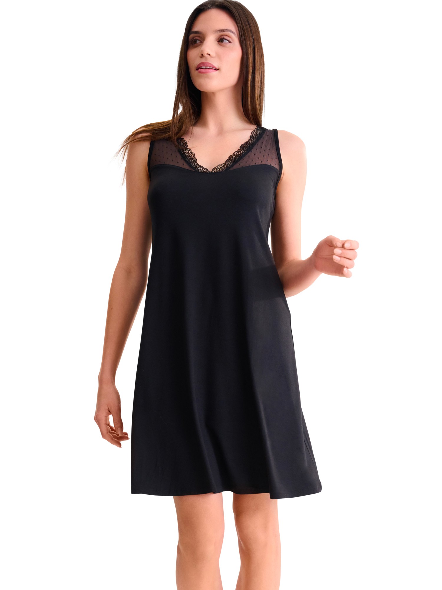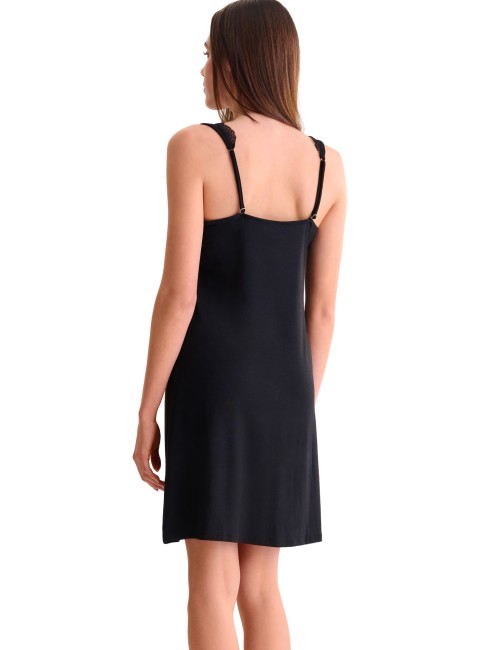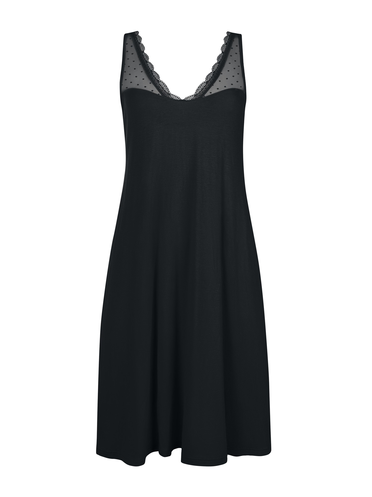 Nuisette féminine sans manches en tricot de viscose confortable associé à du tulle et de la dentelle romantique. Encolure fantaisie en forme de coeur, bordure en tulle et dentelle à l'encolure. Les bretelles sont réglables à l'arrière pour un ajustement parfait. La version noire est rehaussée de tulle à pois pour une touche de fantaisie supplémentaire. Longueur environ 95 cm.