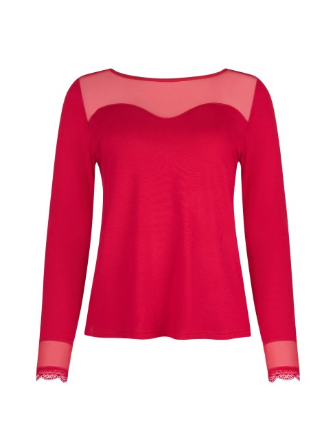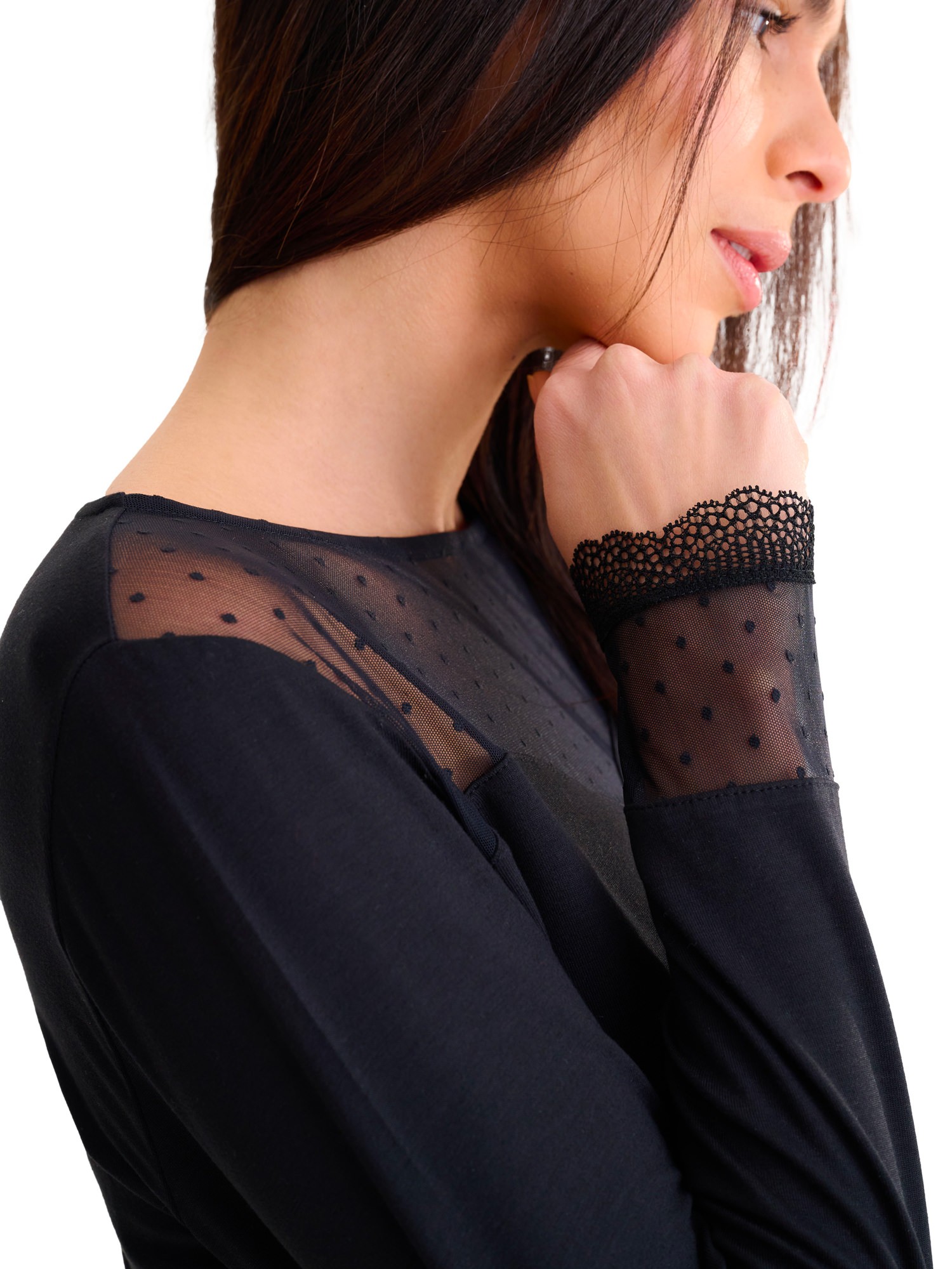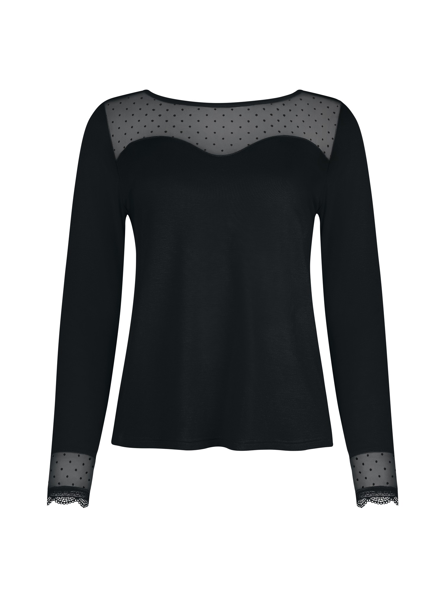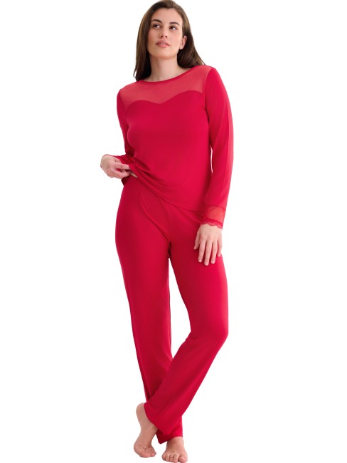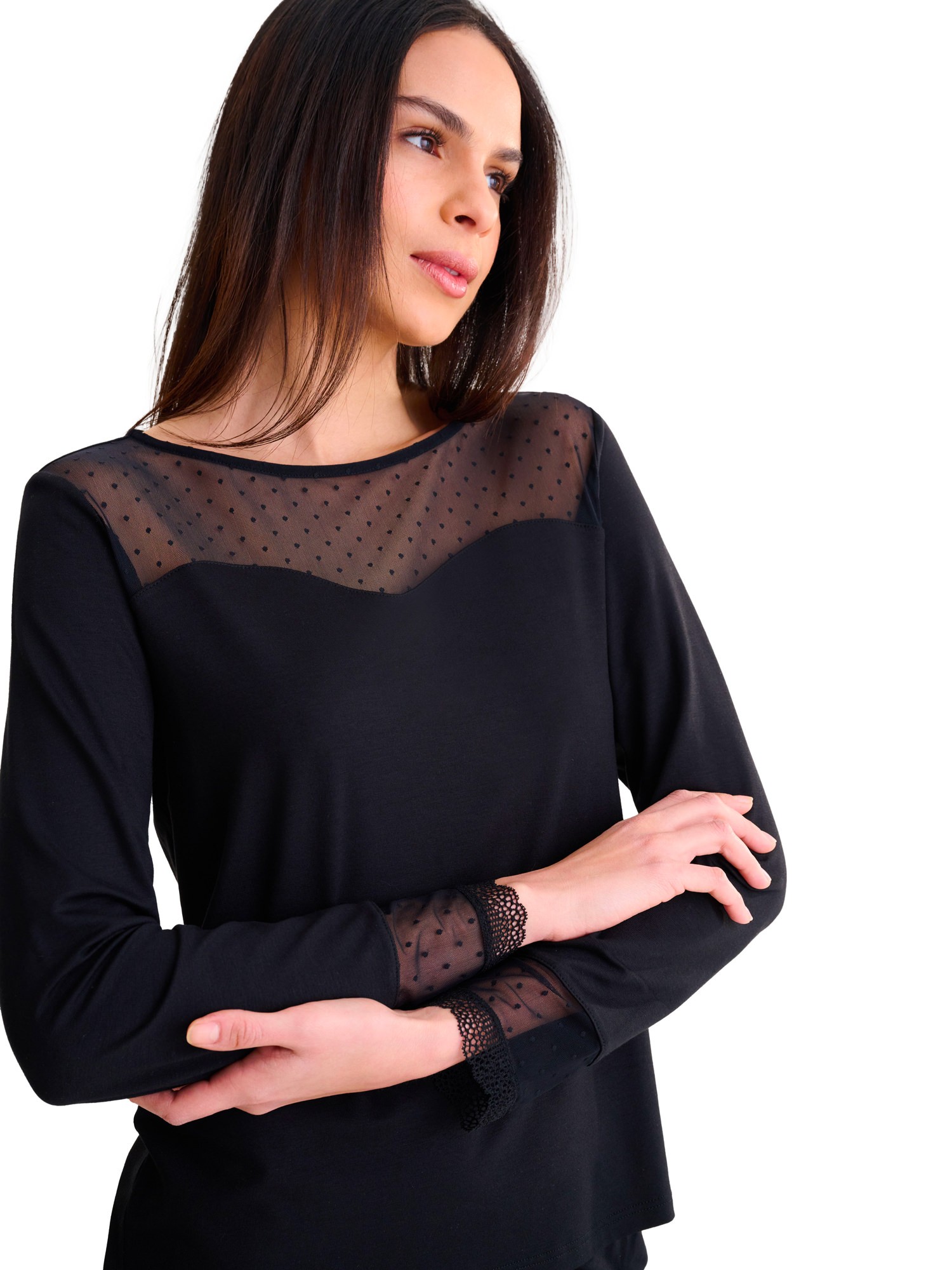 Pyjama féminin en tricot de viscose confortable associé à du tulle et de la dentelle romantique. Il se compose d'un haut à manches longues et d'un pantalon long à coupe droite. Encolure fantaisie en forme de coeur, finitions en tulle transparent et dentelle sur les manches. La version noire est rehaussée de tulle à pois pour une touche de fantaisie supplémentaire.