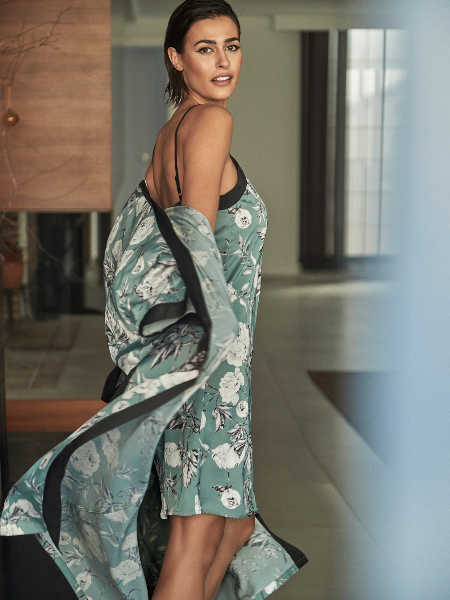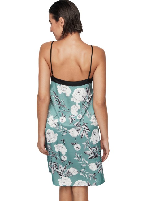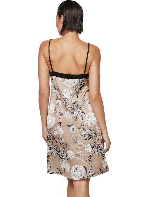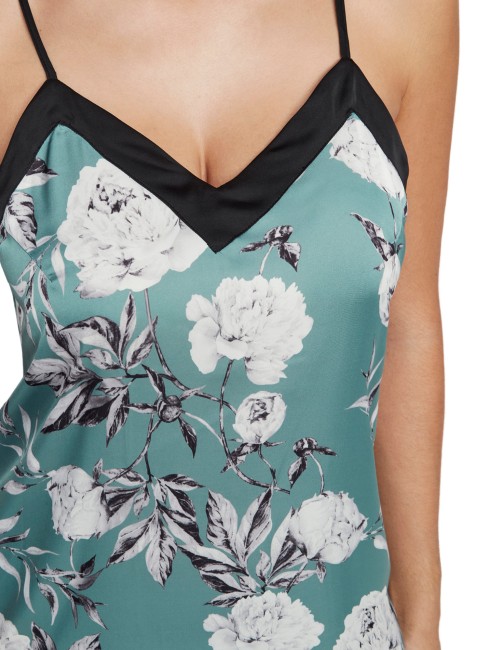 Nuisette courte élégante et sophistiquée, parée d'un imprimé floral magnifique sur toute la surface. Le décolleté est souligné d'un passepoil satiné noir jusque dans le dos. Les fines bretelles sont réglables pour un ajustement parfait.