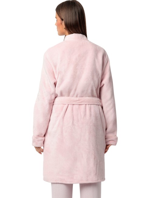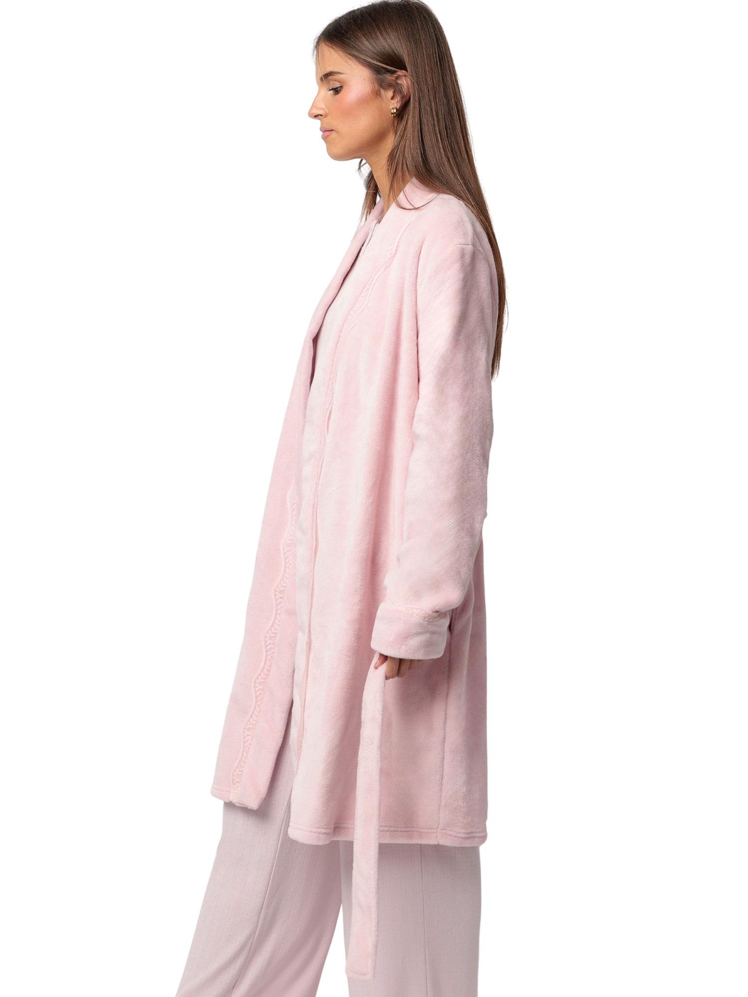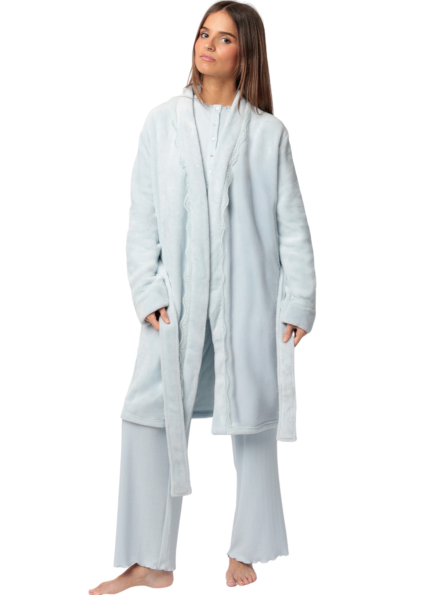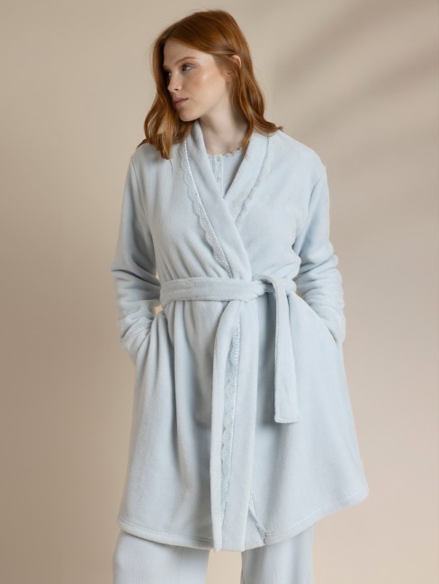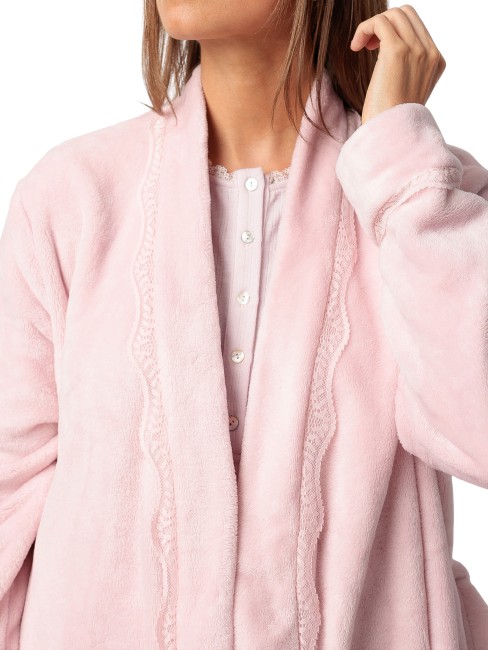 Robe de chambre à manches longues dans un style classique et élégant, idéale pour l’hiver et les matinées fraîches. Tissu polaire Corel effet velours, chaude et très douce au toucher. Elle a un col châle large pour bien couvrir le haut du buste, et une ceinture à nouer à la taille. Une jolie bordure fine en dentelle ondulée ton sur ton suit l’ouverture de la robe de chambre, ajoutant une note féminine et délicate. Poches latérales pratiques et discrètes. Avec ses teintes tendres et apaisantes, symbole de douceur et de confort, cette robe de chambre est un modèle ultra doux et féminin, parfait pour les moments cocooning à la maison. Livrée dans une boîte-coffret Admas.