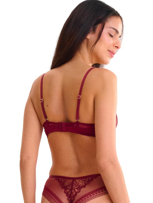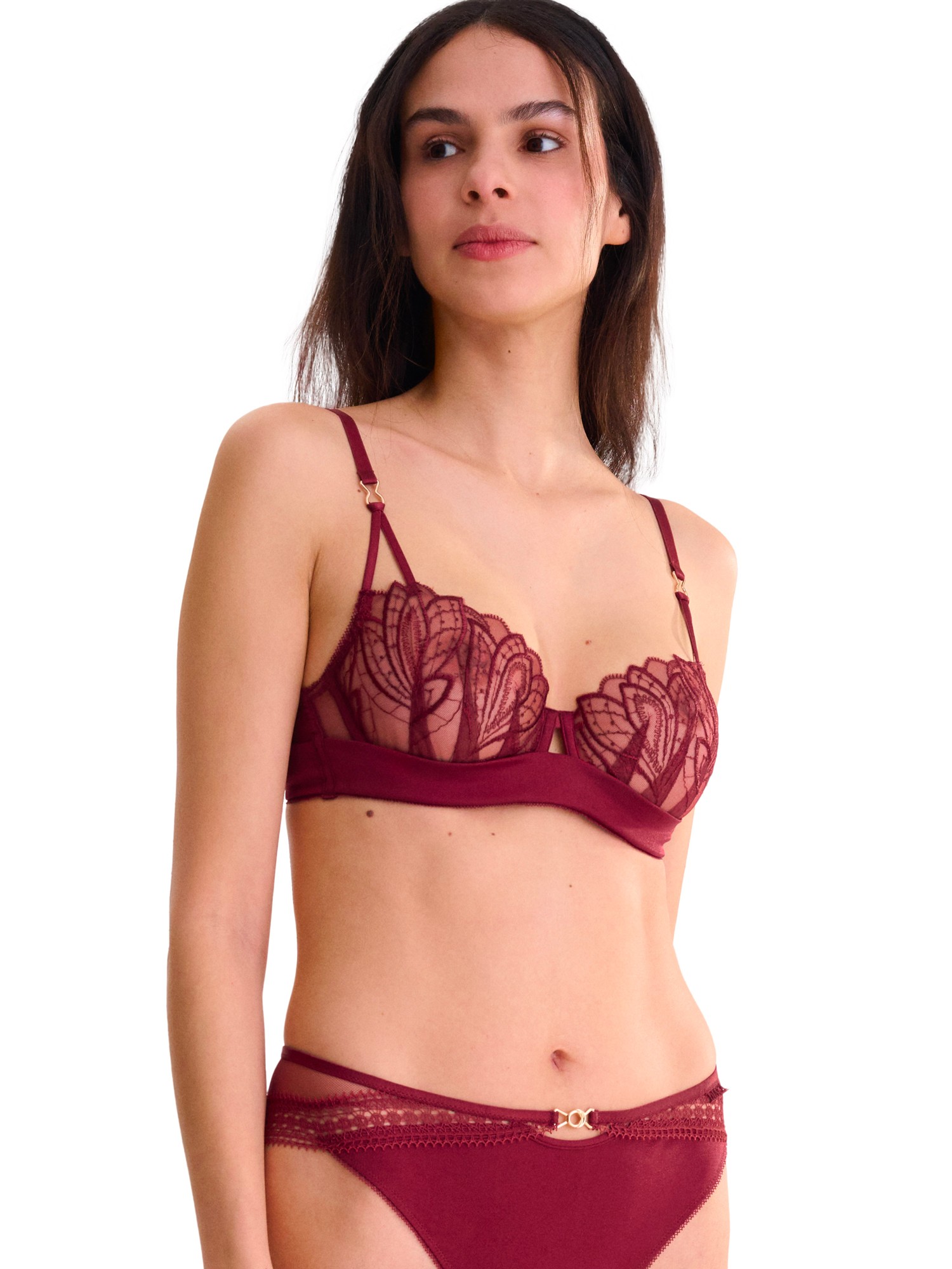 Sophistication, élégance moderne et séduction subtile s'entremêlent dans cette série. Conçue pour une femme sûre d'elle et élégante, qui apprécie les détails et l'excellence artisanale. Tricot recyclé technologiquement sophistiqué avec un éclat cristallin, traité de manière à permettre des ourlets fins et ainsi une esthétique moderne impeccable et un confort maximal. Associé à un ourlet brodé sélectionné dans un motif organique stylisé, une dentelle fine délicate et sophistiquée et un tricot en maille transparente séduisante, il représente une harmonie entre luxe, élégance et confort. Conception sans coutures avec un jeu de dentelle fine et de bandes étroites avec des décorations métalliques. La série est disponible en deux teintes sensuelles : rouge grenat et noir, chacune soulignant la féminité, la sophistication et la force.
