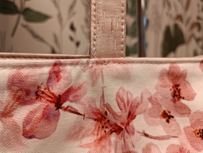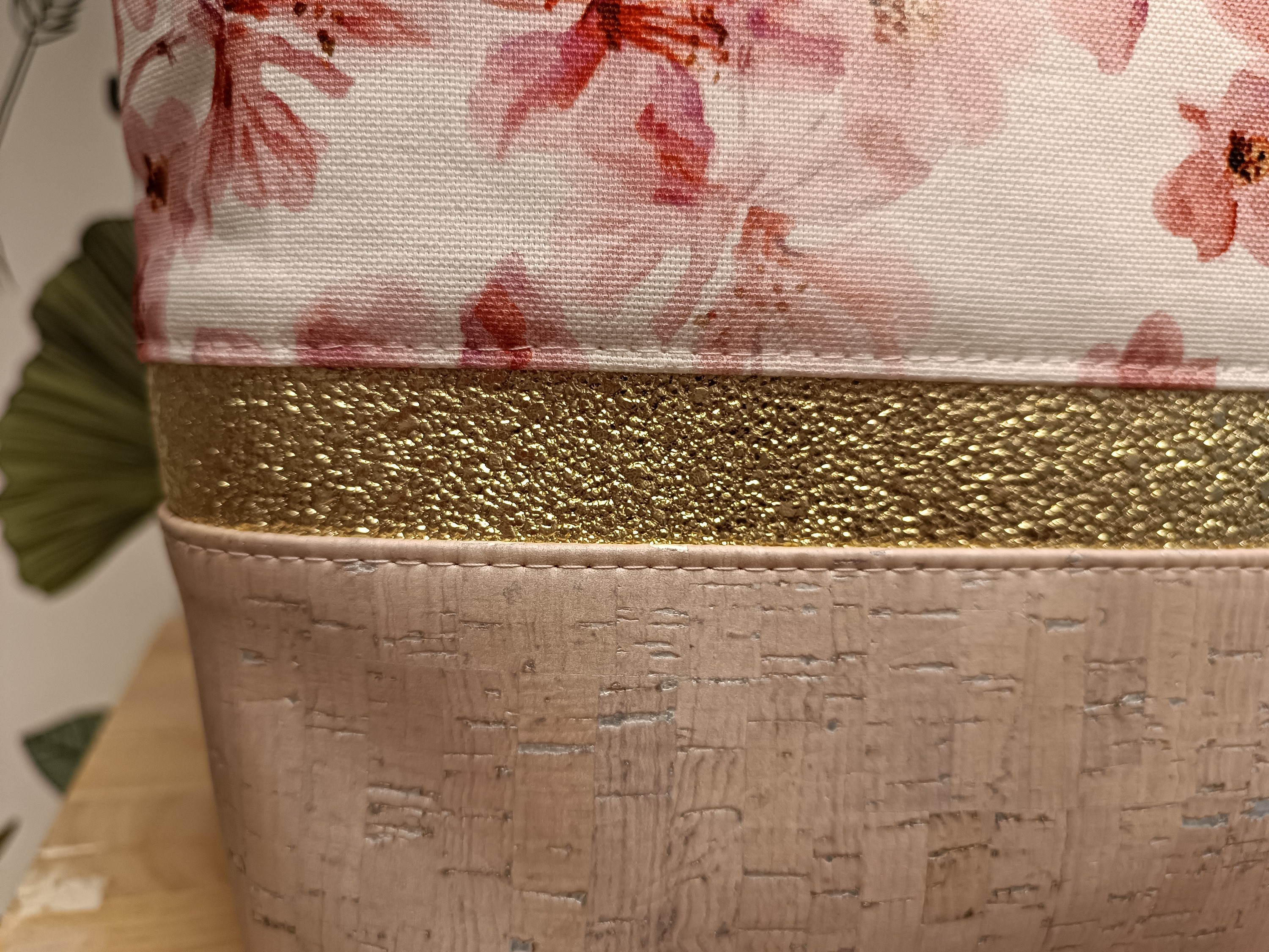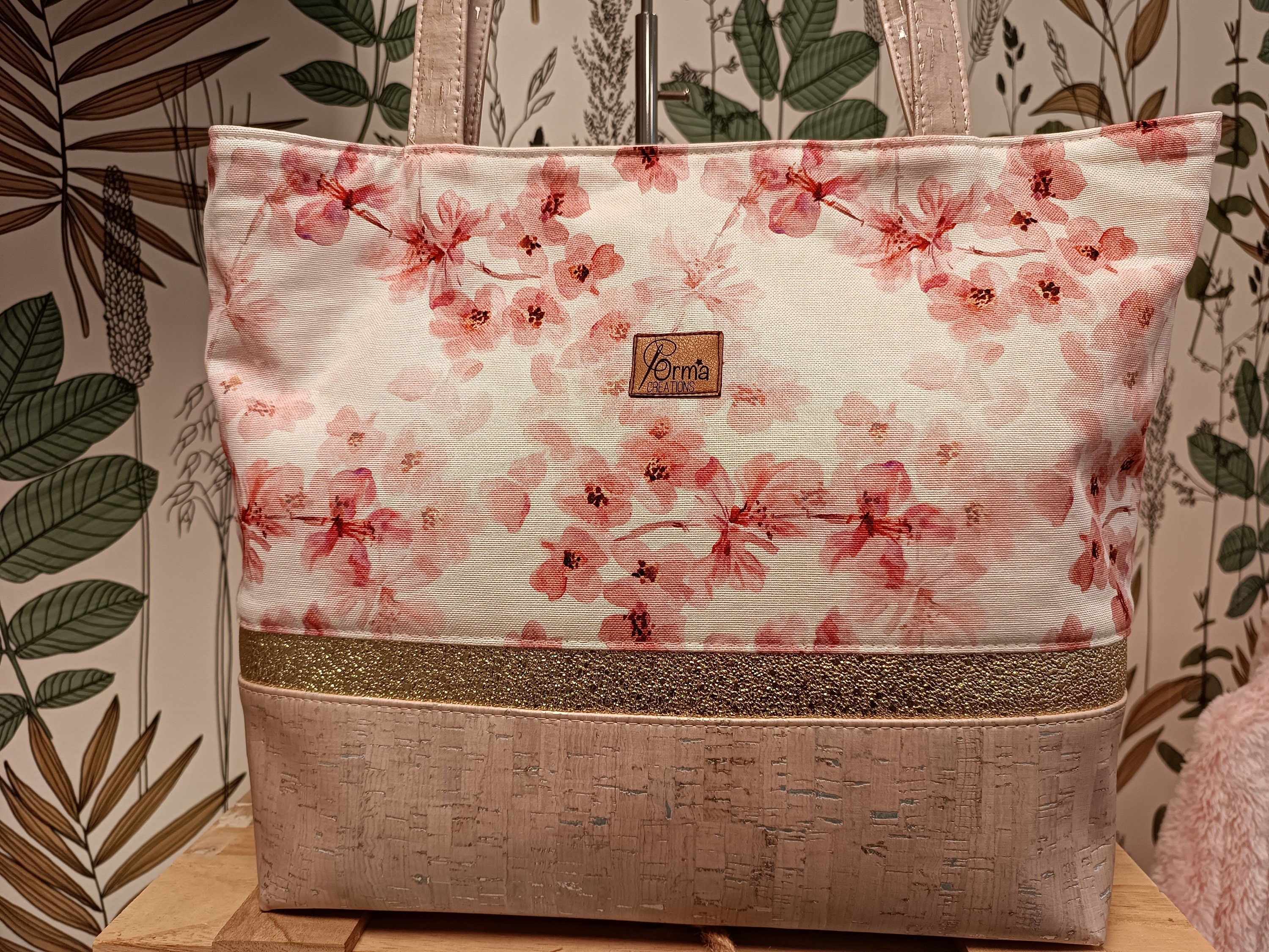 Sac à main, sac cabas, sac porté épaule, sac plage, toile de coton aux motifs fleurs de cerisier Sakura, simili texturé doré, liège naturel rose nacré.