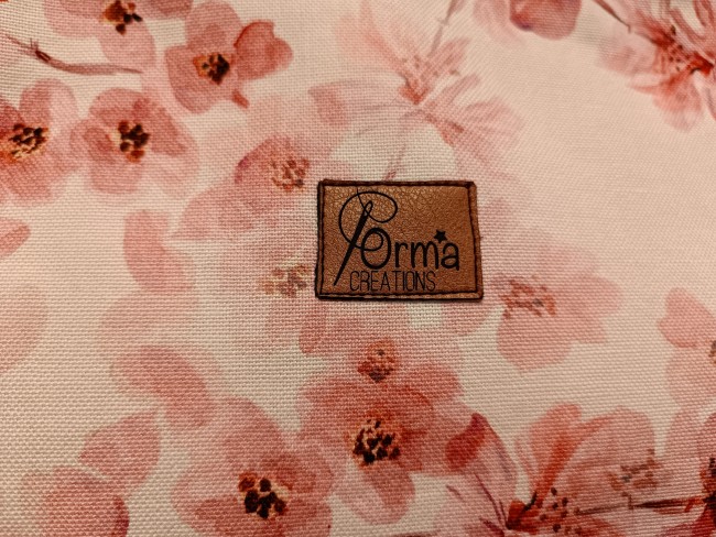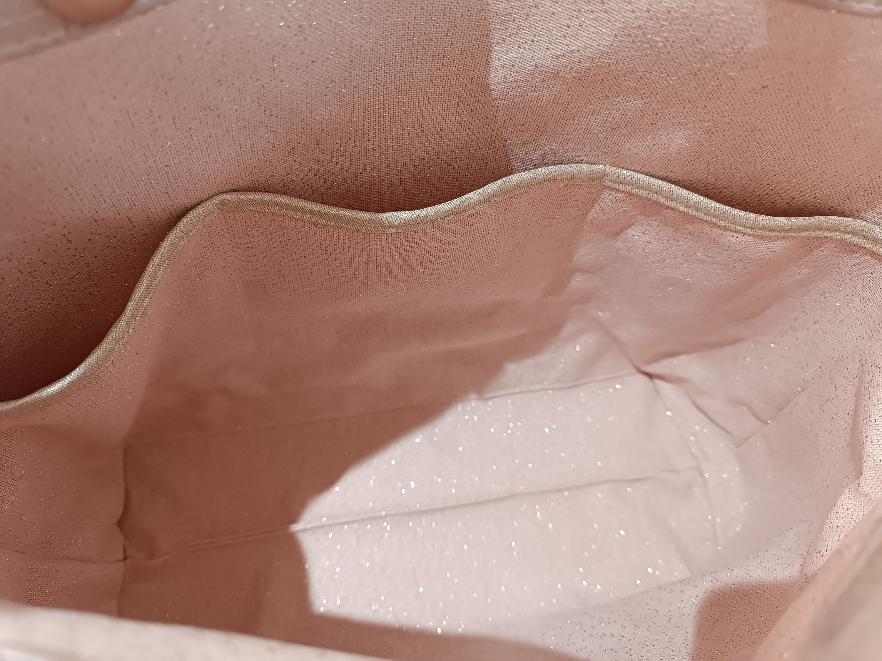 - 3 poches de même taille pour mettre son téléphone, ses lunettes, ses clés ... en toile de coton rose poudré avec fil lurex doré, ornées par un biais doré.