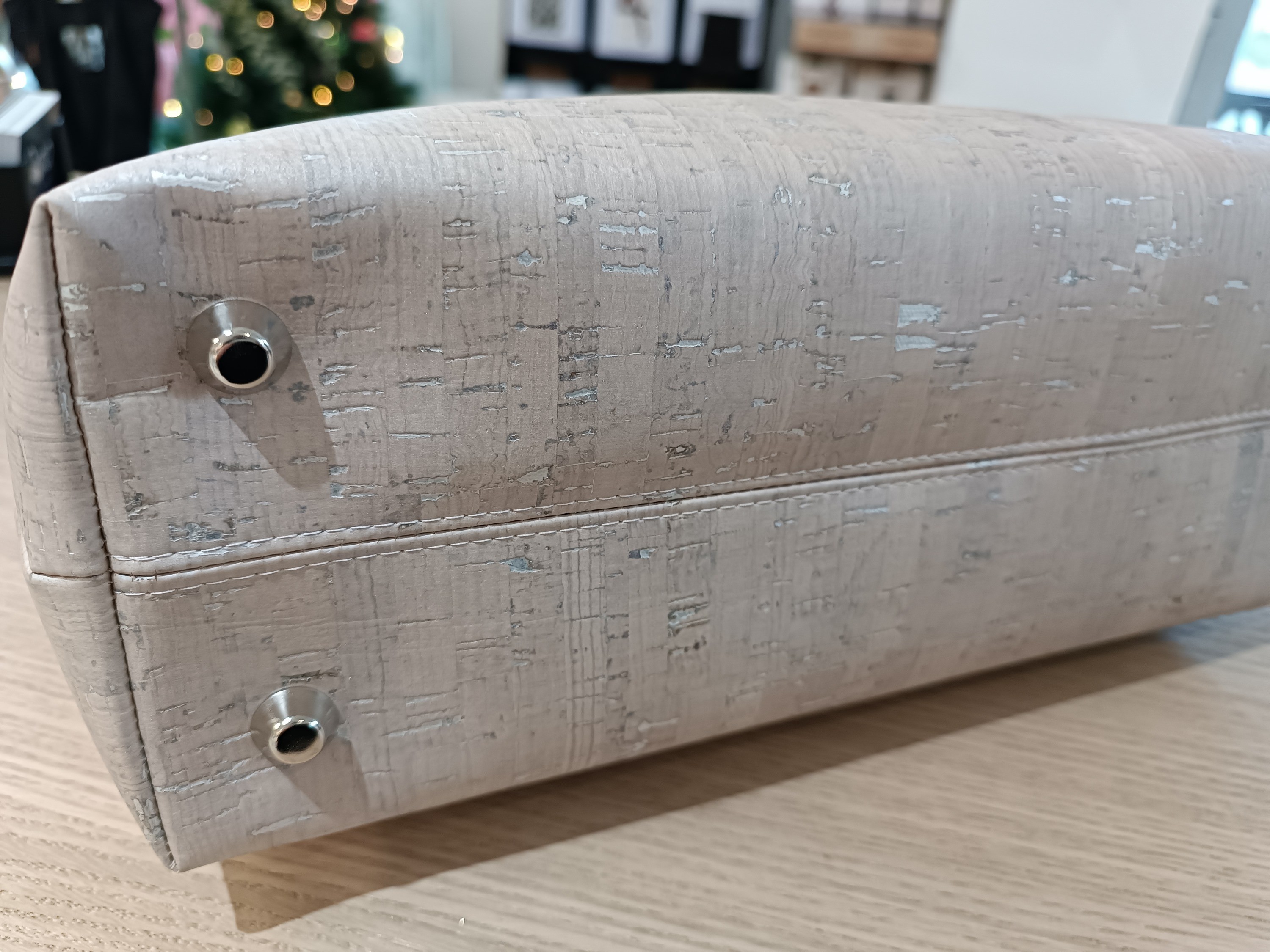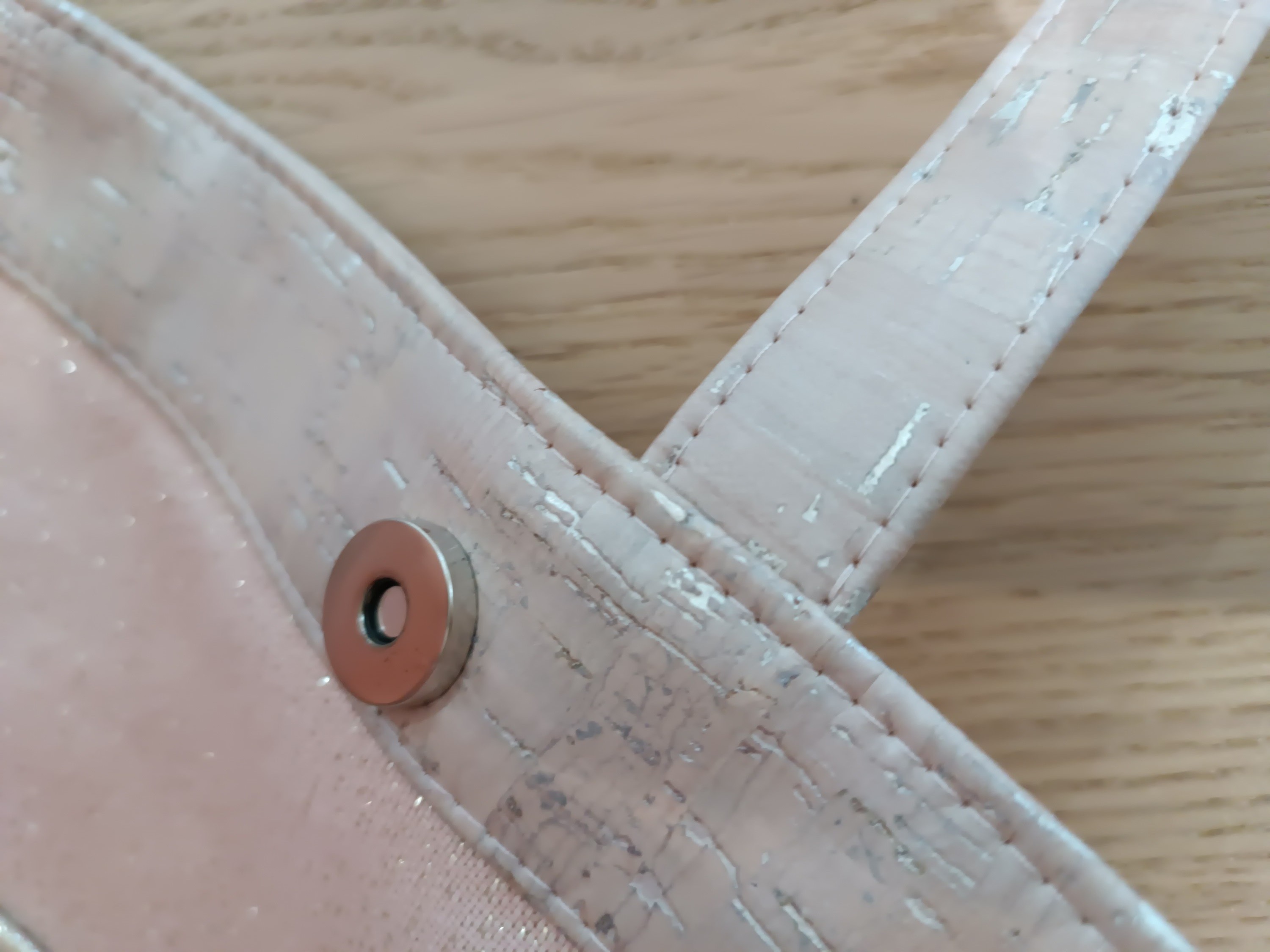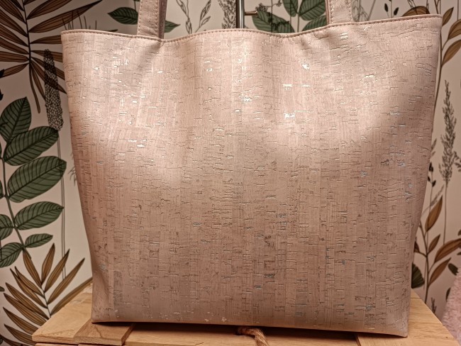 Les anses sont en liège naturel rose nacré, d'une longueur d'environ 58 cm.