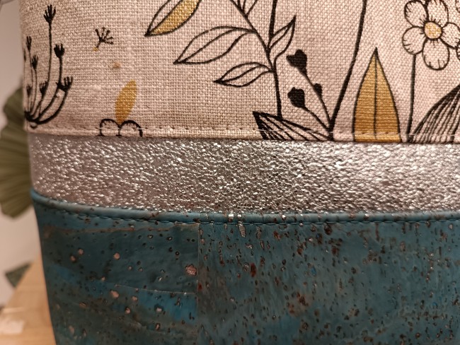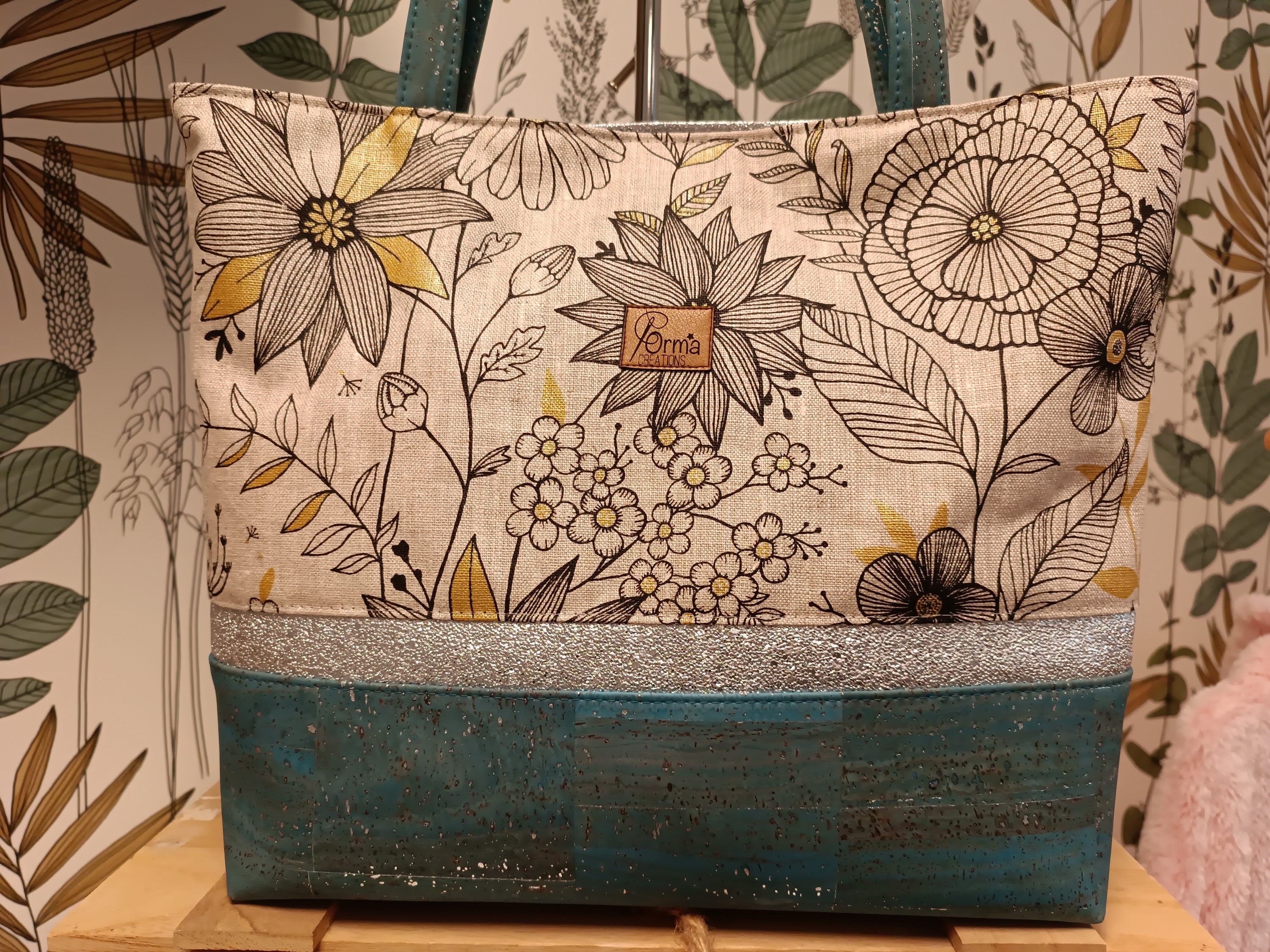 Sac à main, sac cabas, sac porté épaule, sac plage, toile de lin aux motifs fleurs de pissenlit noires et dorées, simili texturé argenté, liège naturel bleu marbré argenté.