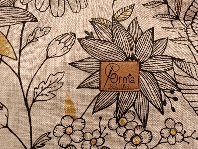 - Partie haute en toile de lin aux motifs fleurs de pissenlit noires et dorées sur fond lin naturel