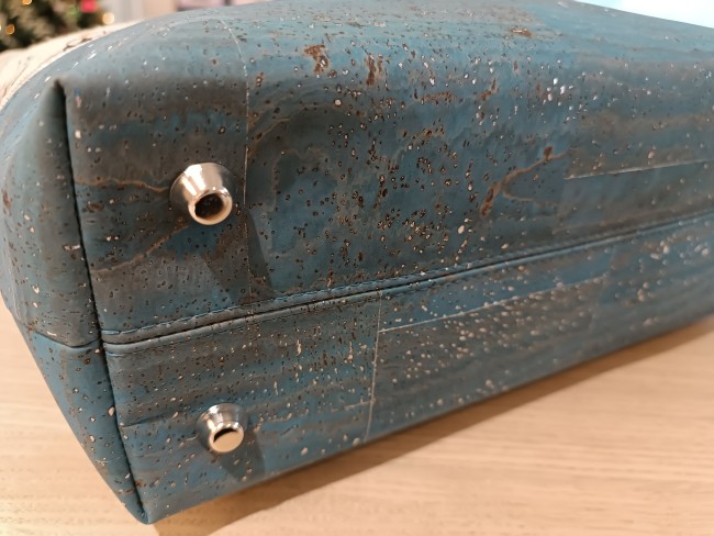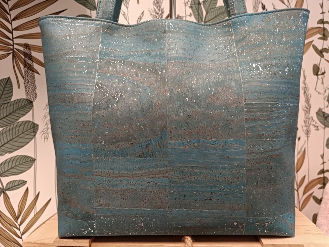 Les anses sont en liège naturel bleu marbré argenté, d'une longueur d'environ 58 cm.