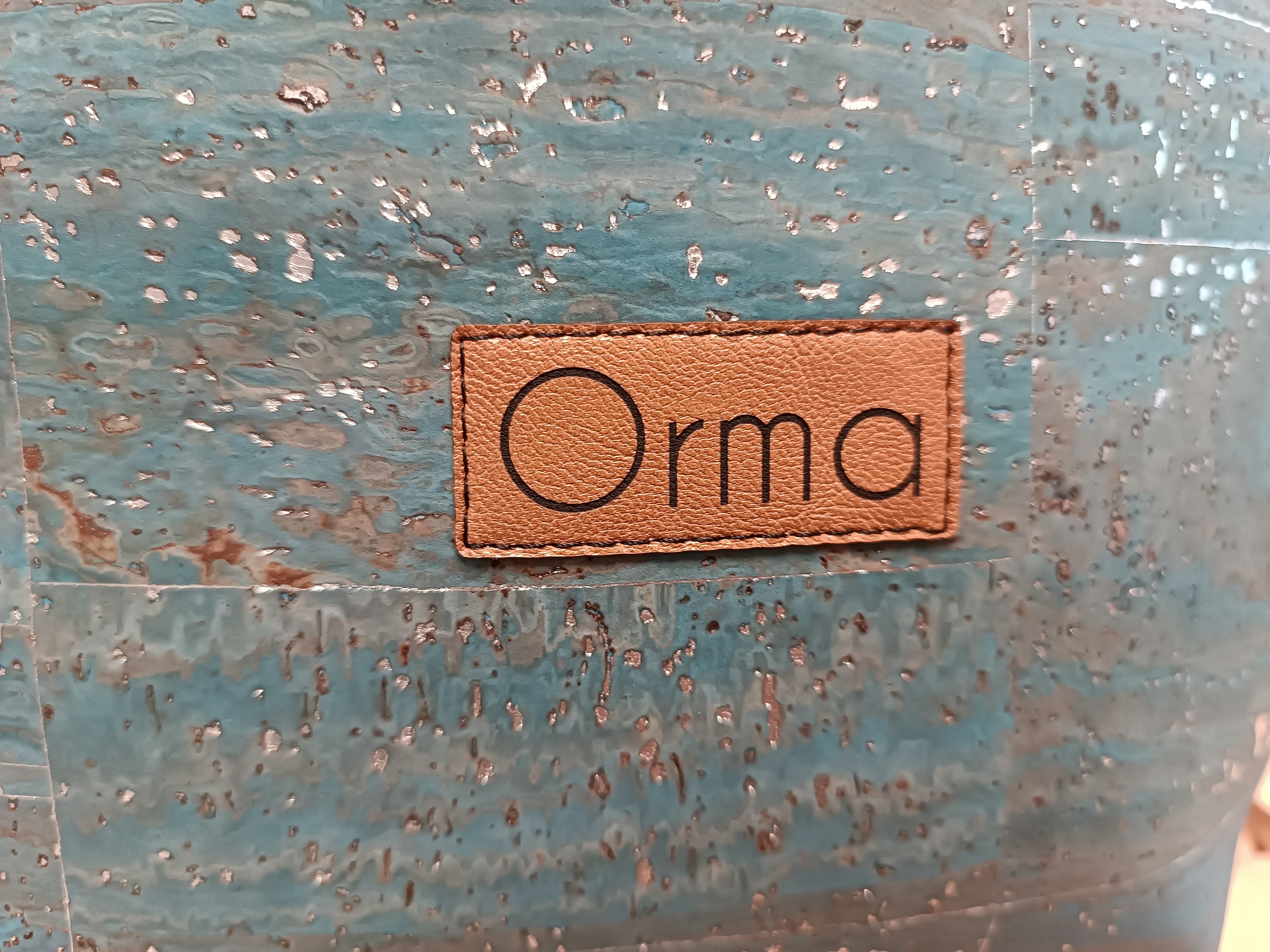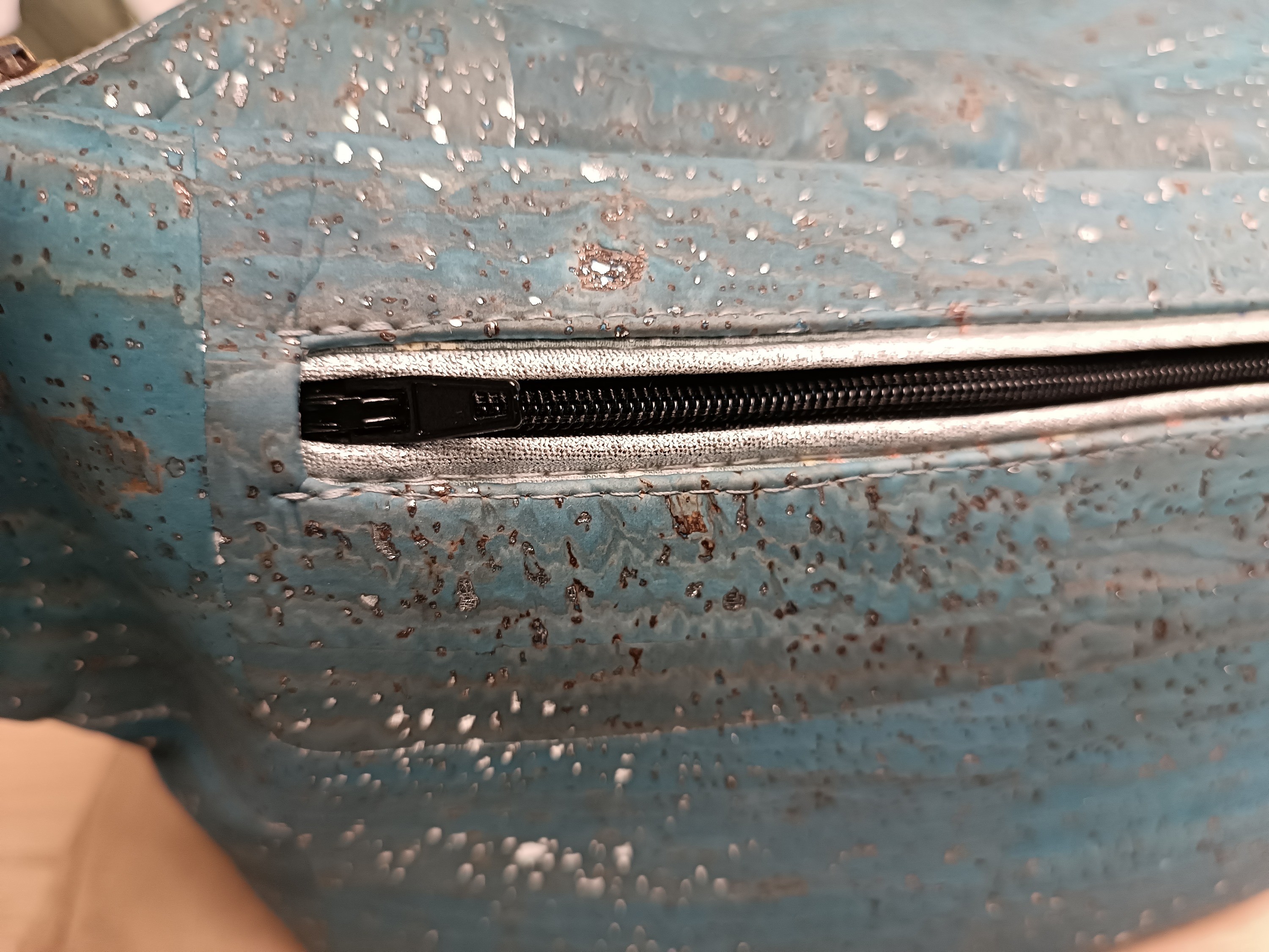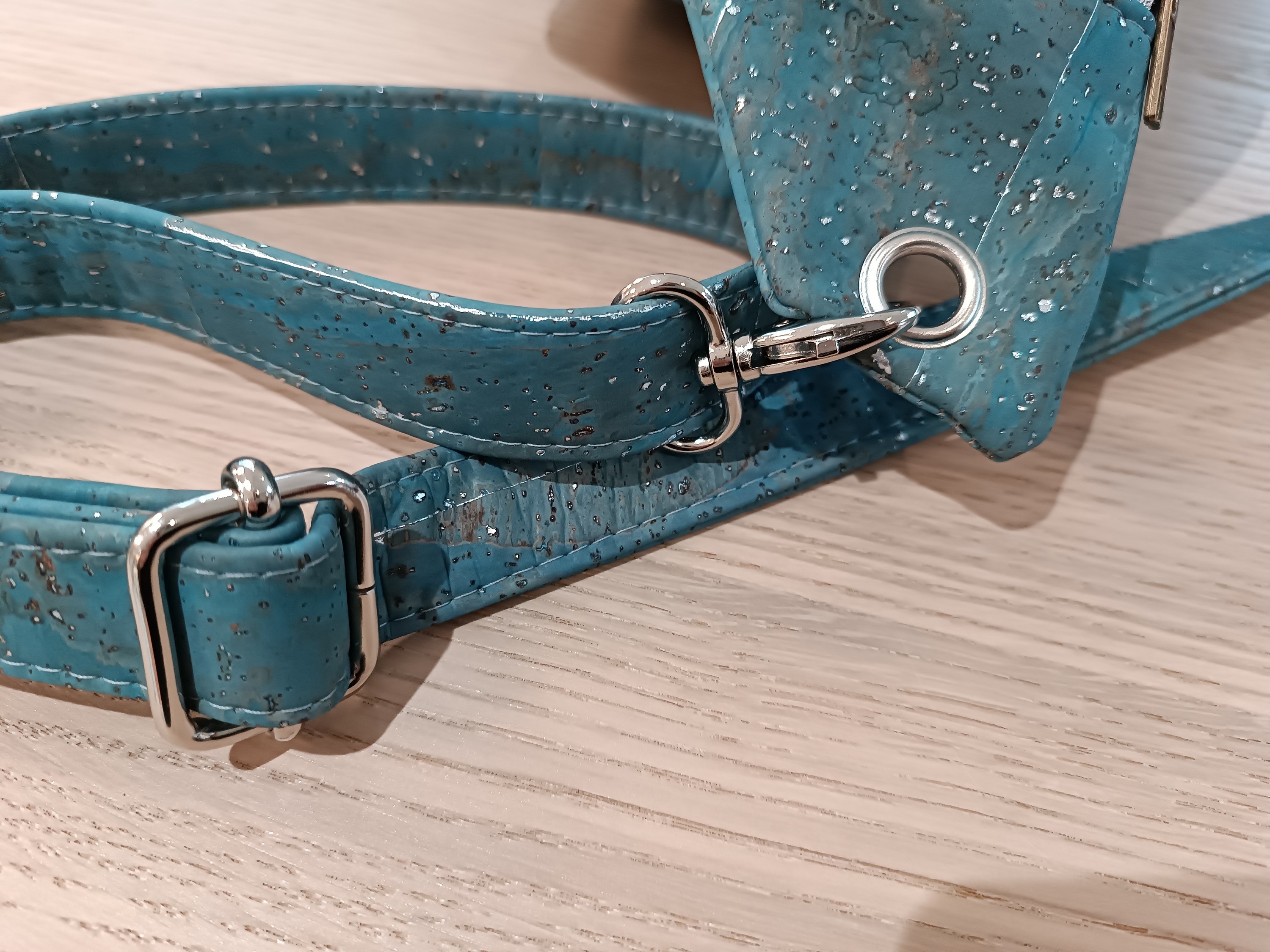 La bandoulière est en liège naturel bleu marbré argenté, réglable.