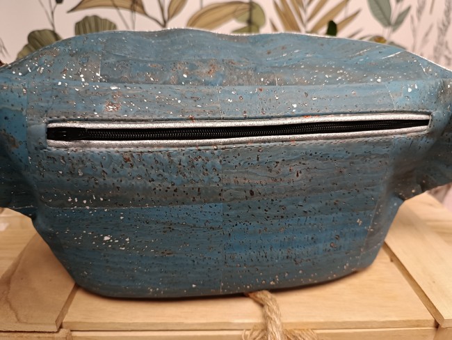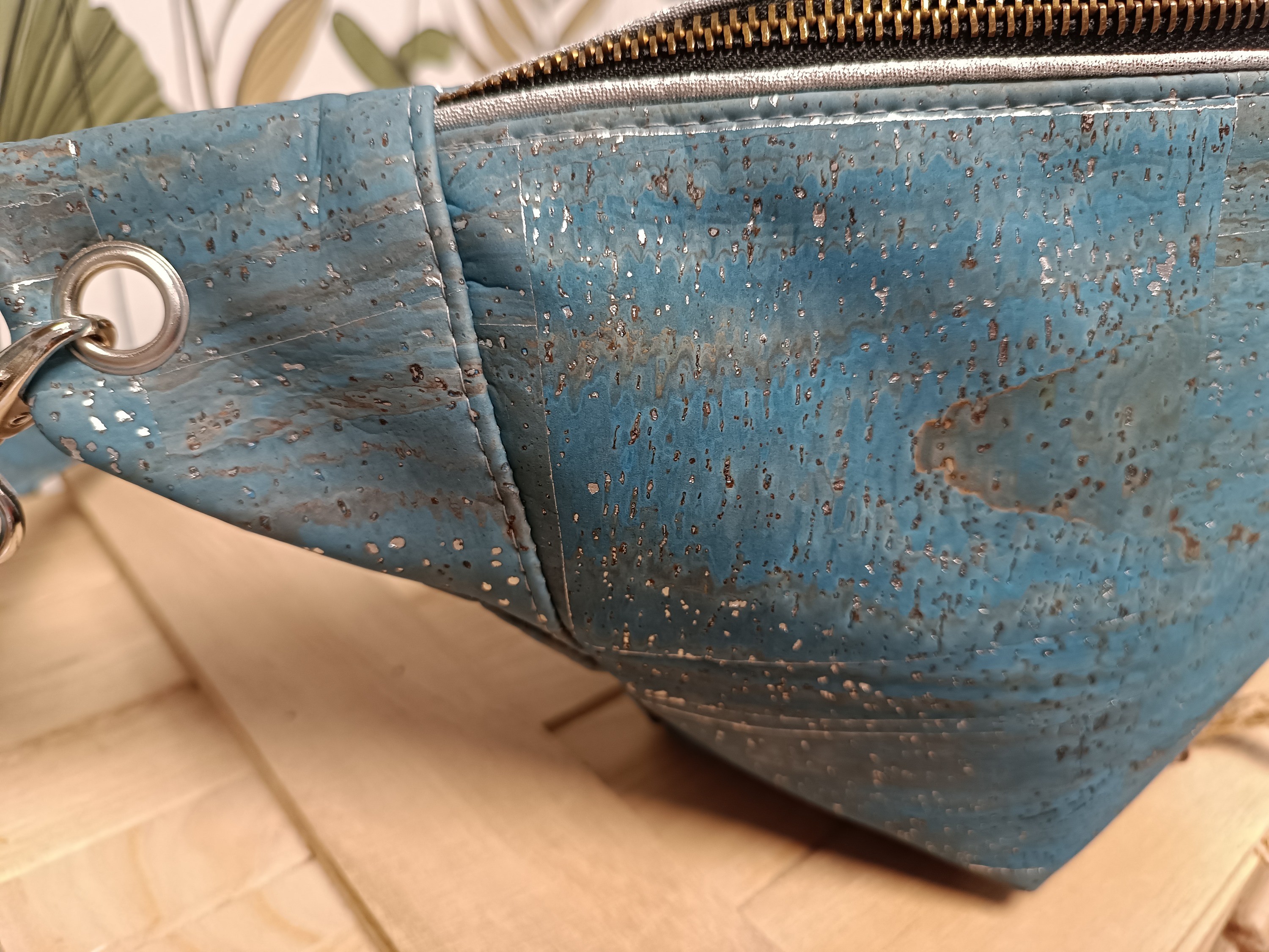 Sac banane, sac bandoulière, liège naturel bleu marbré argenté, passepoil argenté