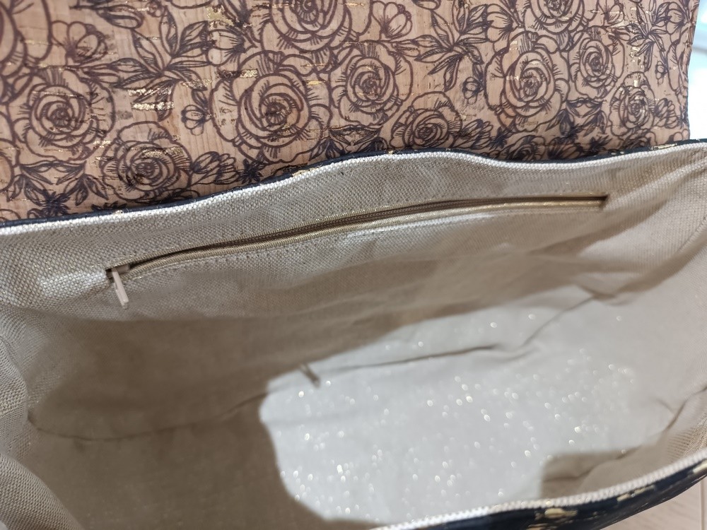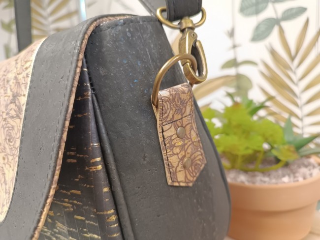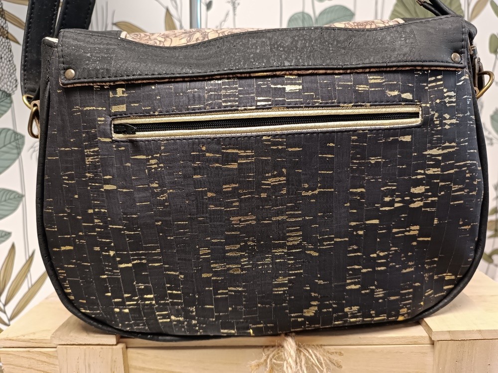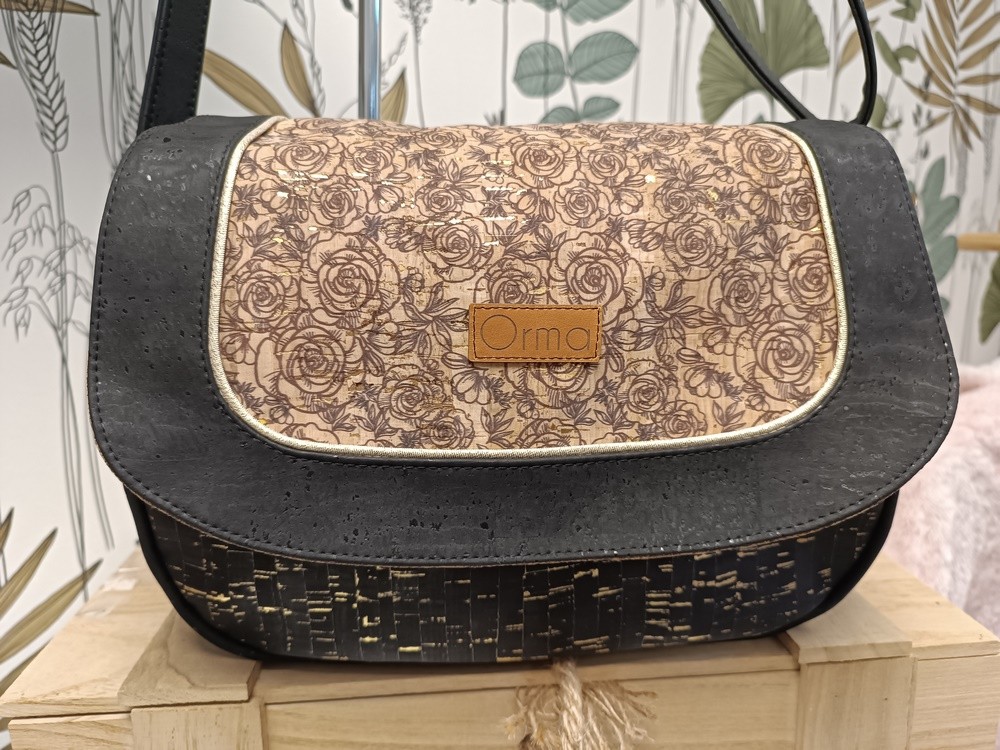 Sac bandoulière, liège naturel noir et noir marbré de doré, liège naturel aux motifs de roses noires et dorées, passepoil doré
