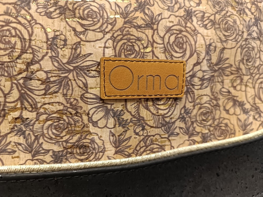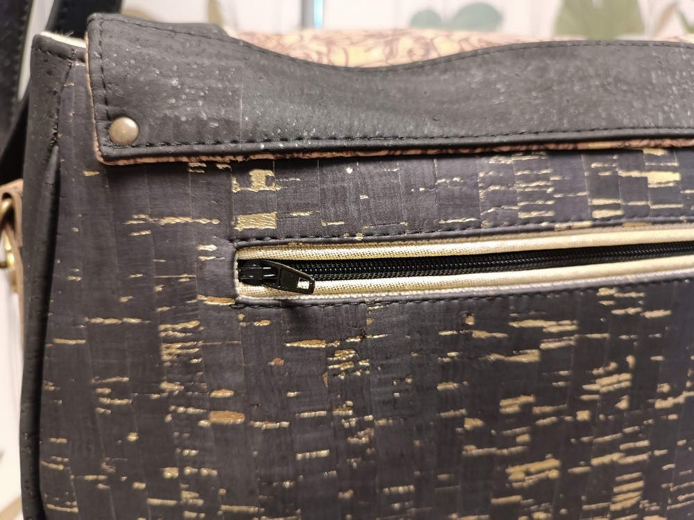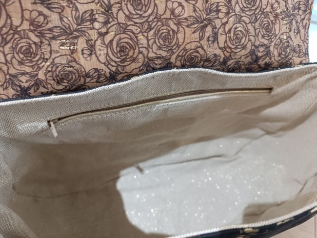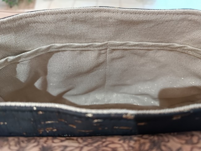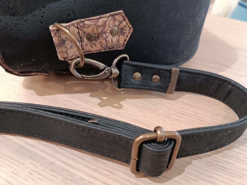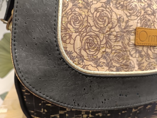 - Corps en liège naturel noir marbré de doré (devant et dos) souligné par un passepoil en liège naturel noir