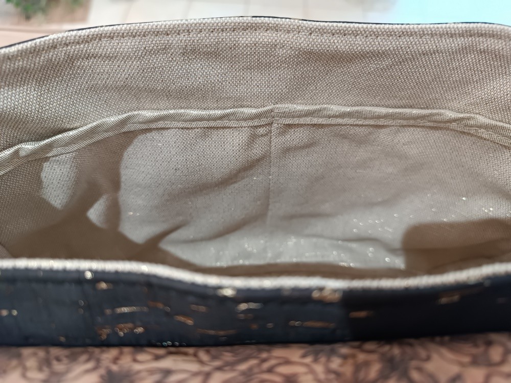 - 1 poche zippée d'environ 19 cm de long et 14 cm de haut, soulignée par un passepoil doré