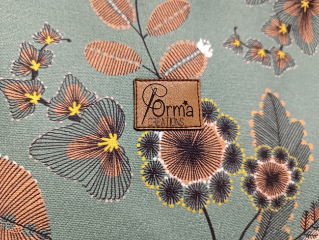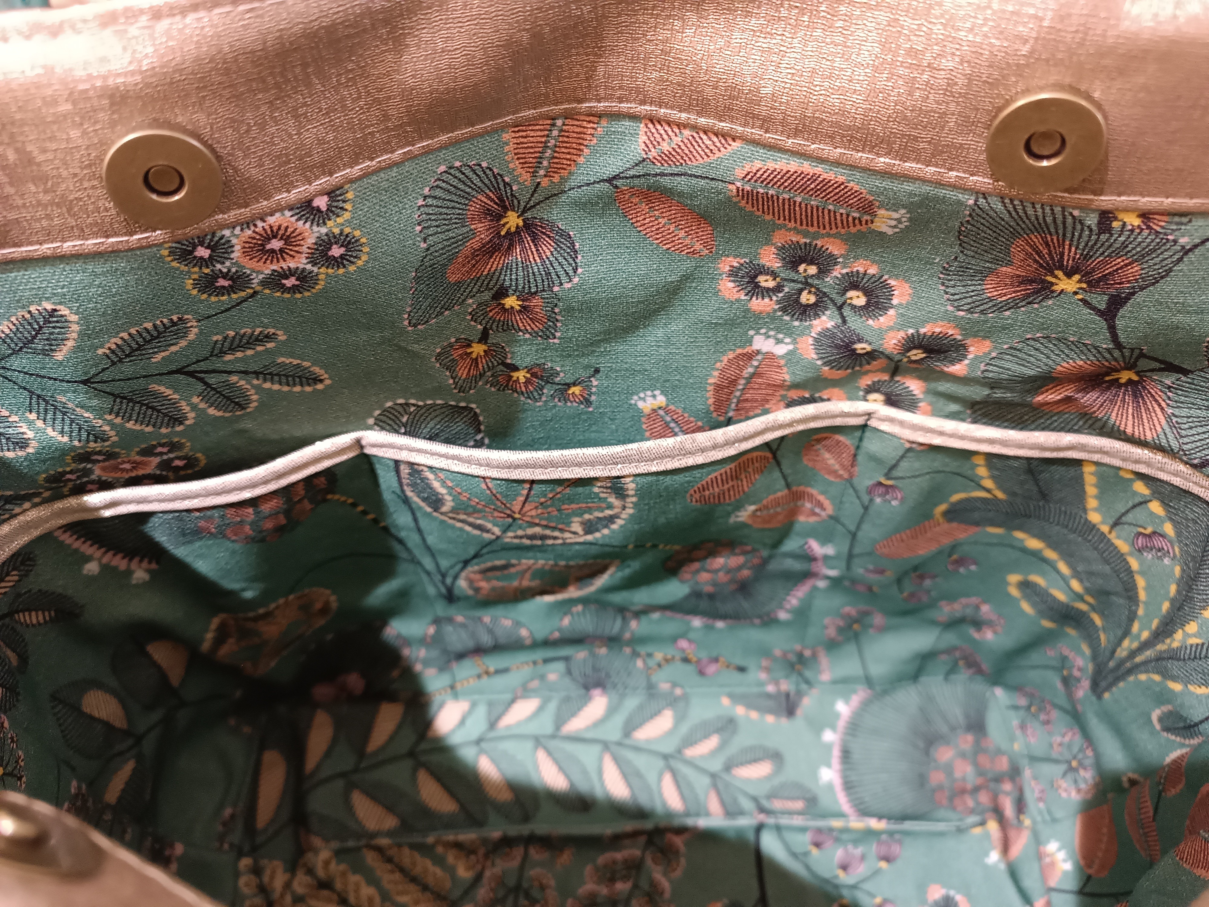 - 3 poches de même taille pour mettre son téléphone, ses lunettes, ses clés ... en toile de coton aux motifs fleuris verts et ocres sur fond vert, ornées par un biais doré.