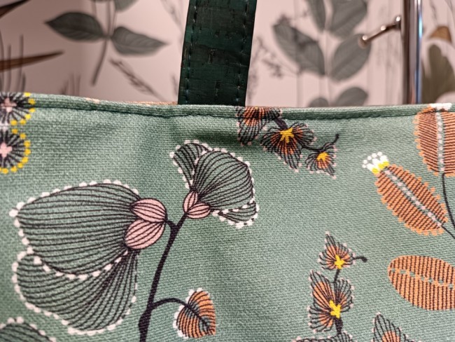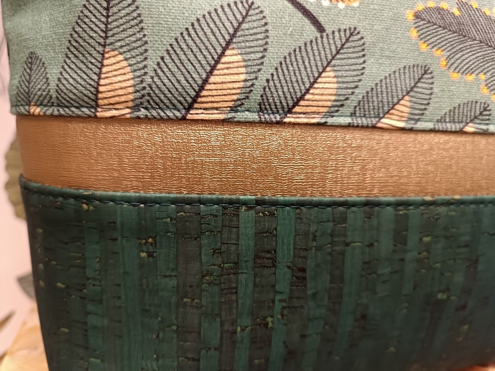 Sac à main, sac cabas, sac porté épaule, sac plage, toile coton aux motifs fleuris, simili texturé doré, liège naturel vert emeraude