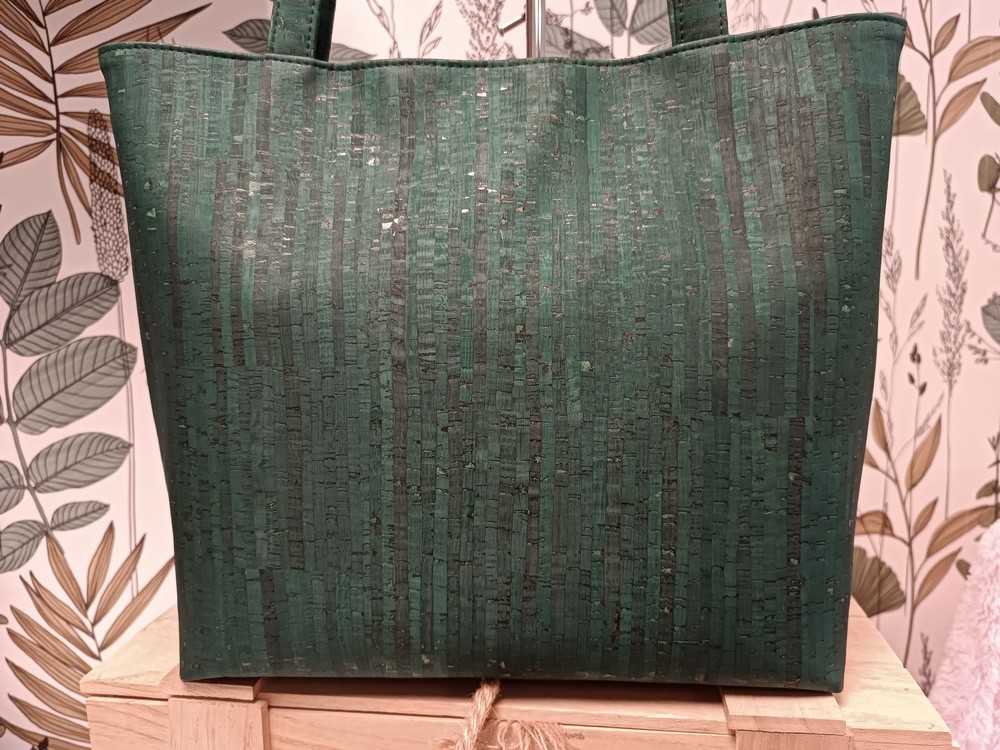 Les anses sont en liège naturel vert emeraude, d'une longueur d'environ 58 cm.