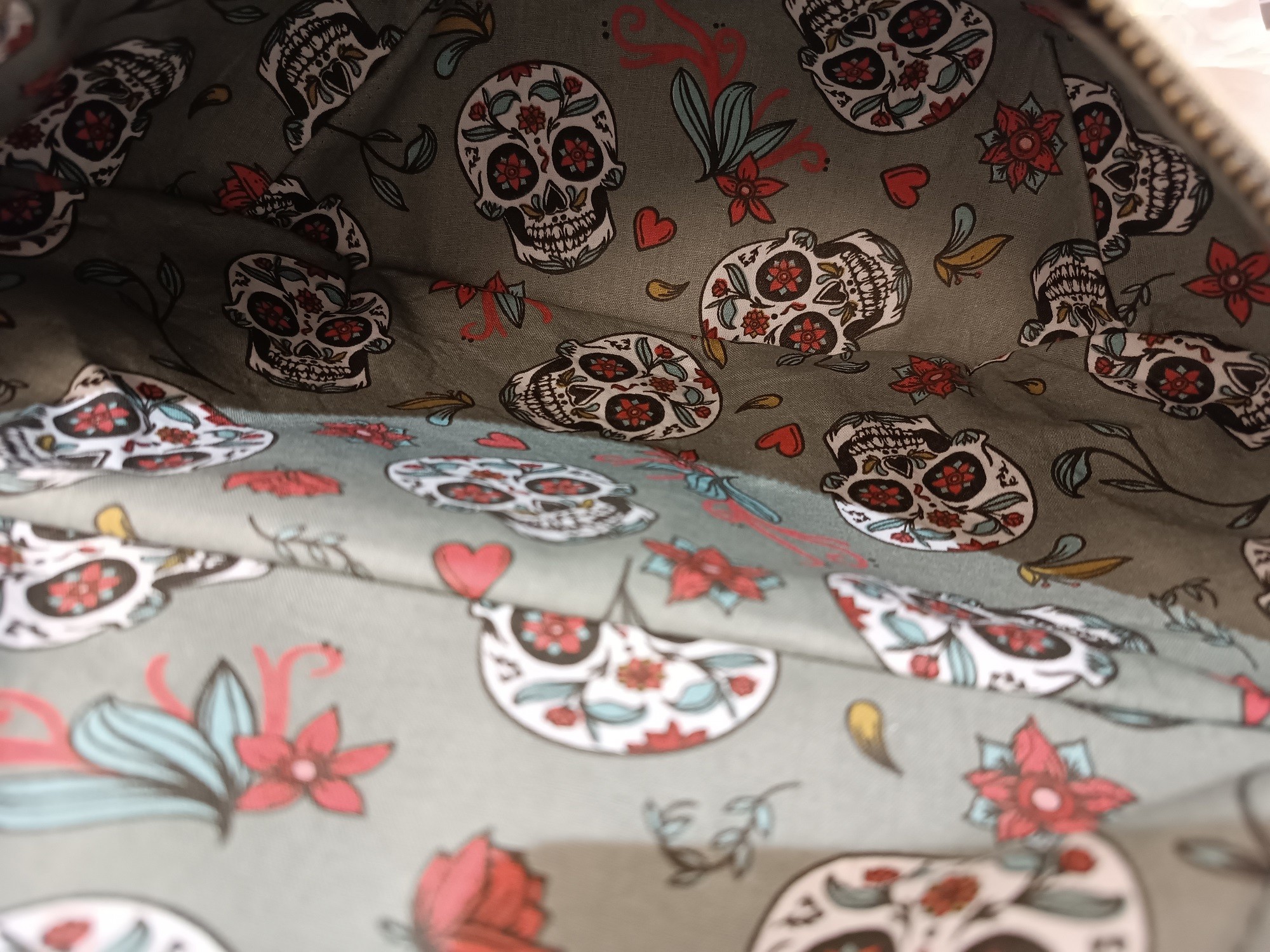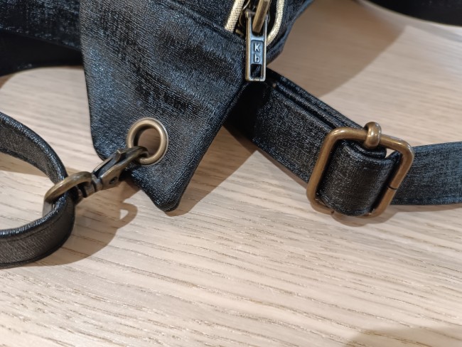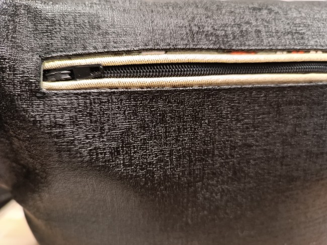 - Au dos, poche zippée d'environ 20 cm de long et 11 cm de haut, soulignée par un passepoil doré, idéal téléphone.