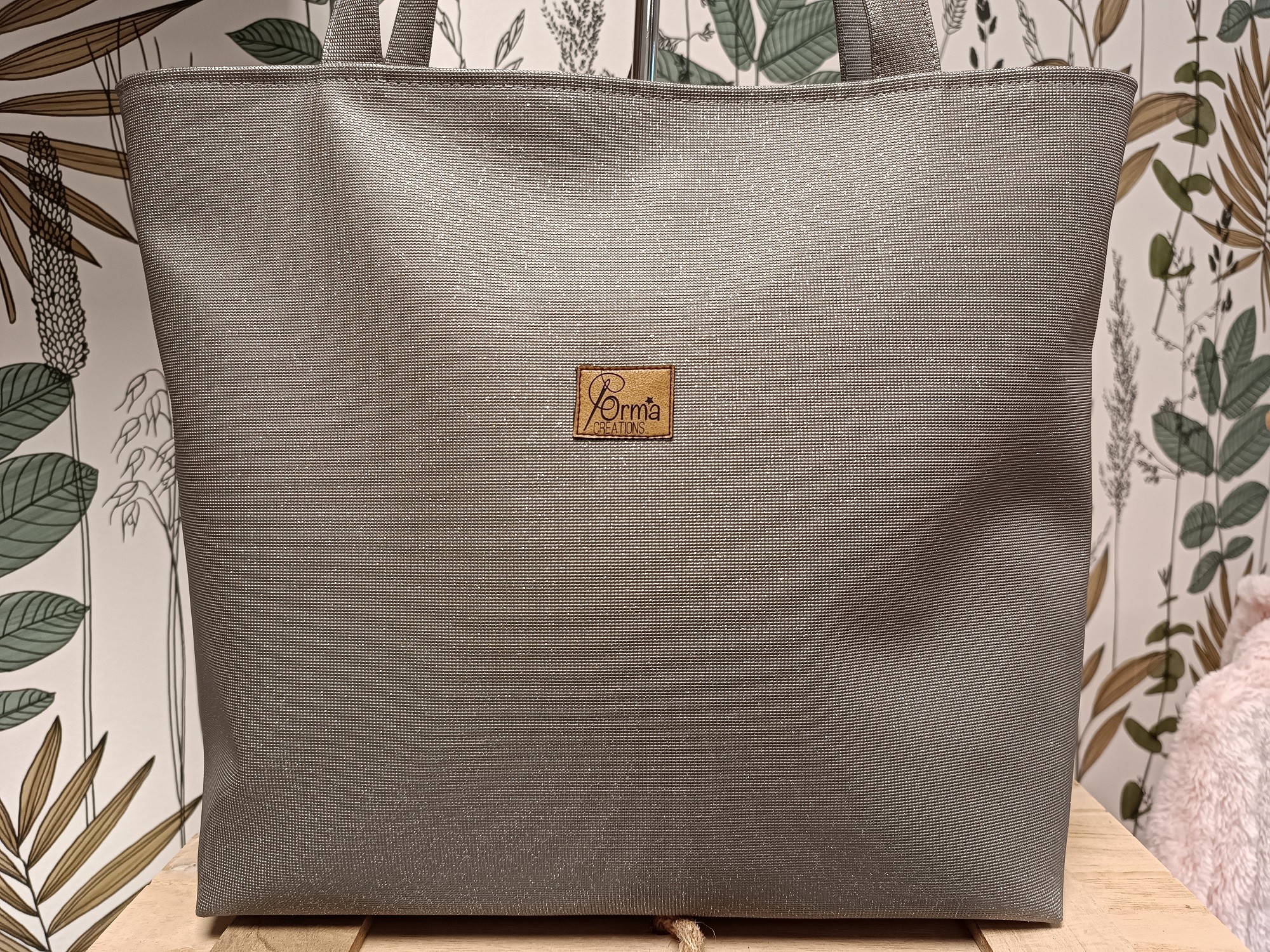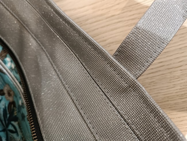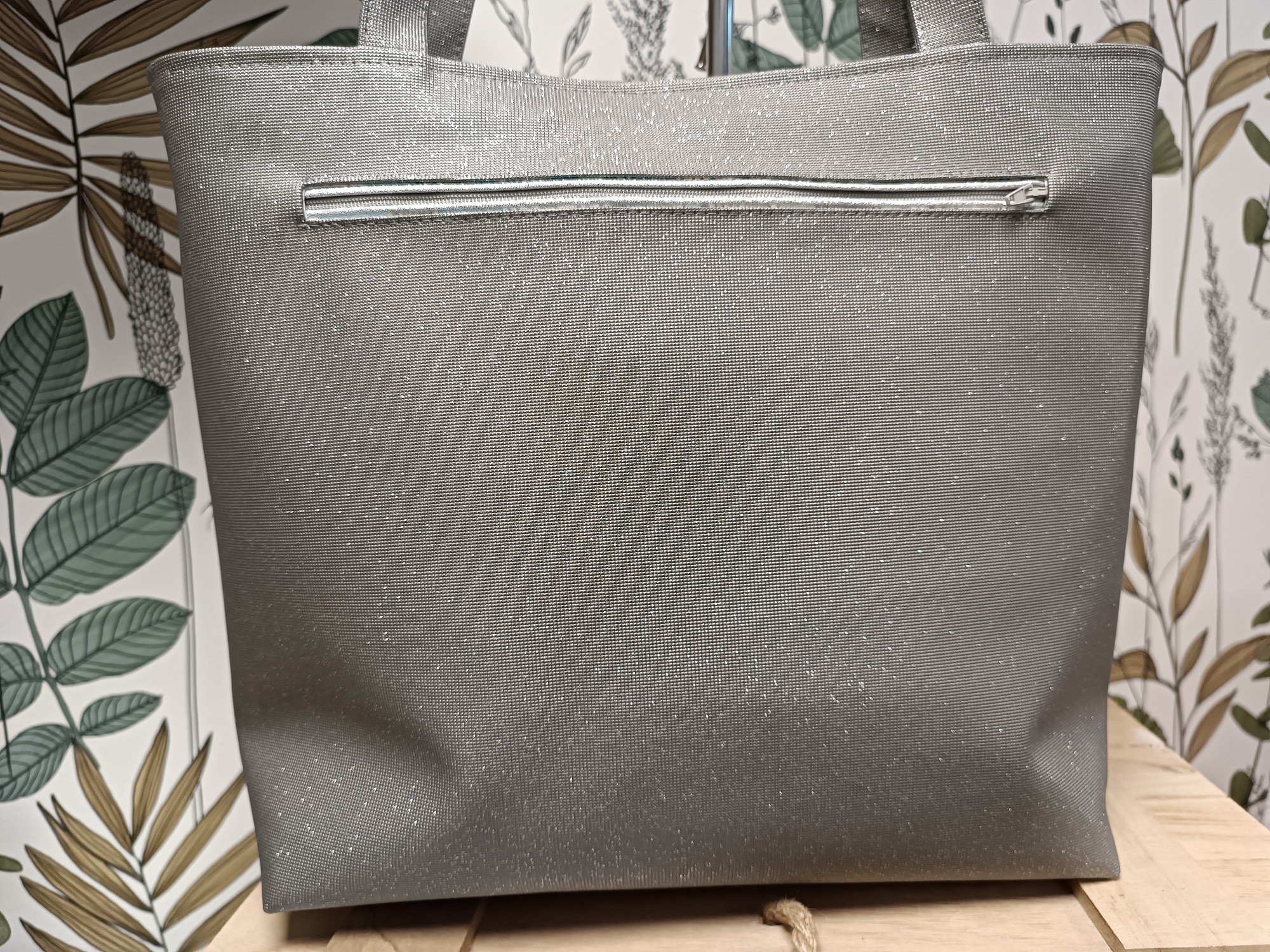 Les anses sont en simili gris pailleté, d'une longueur d'environ 58 cm.
