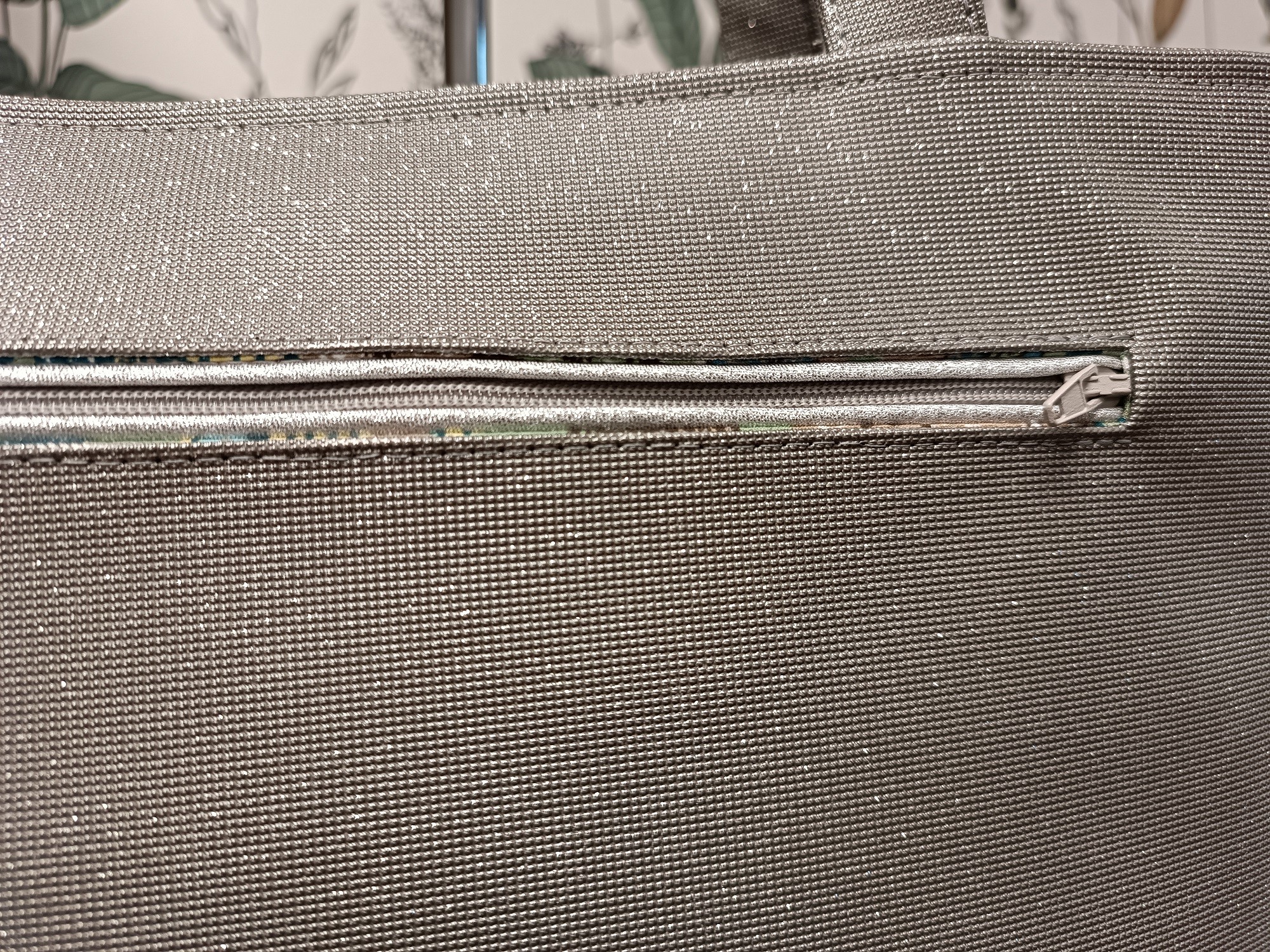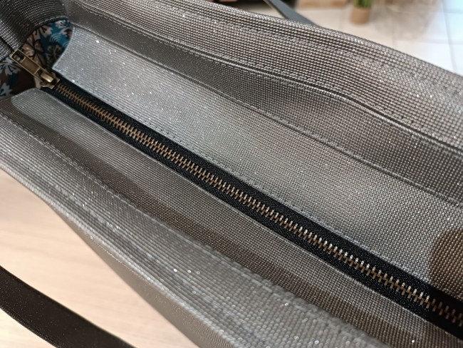 Le sac se ferme grâce à une fermeture éclair ornée de simili gris pailleté (option + 20 euros).