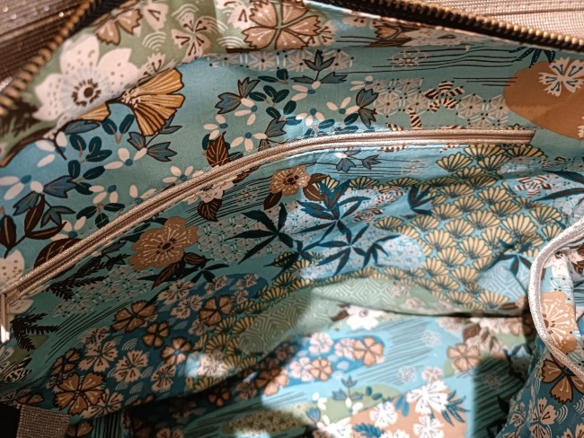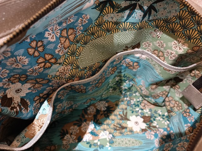 - 3 poches de même taille pour mettre son téléphone, ses lunettes, ses clés ... en toile de viscose aux motifs fleuris bleus et blancs, ornées par un biais doré.