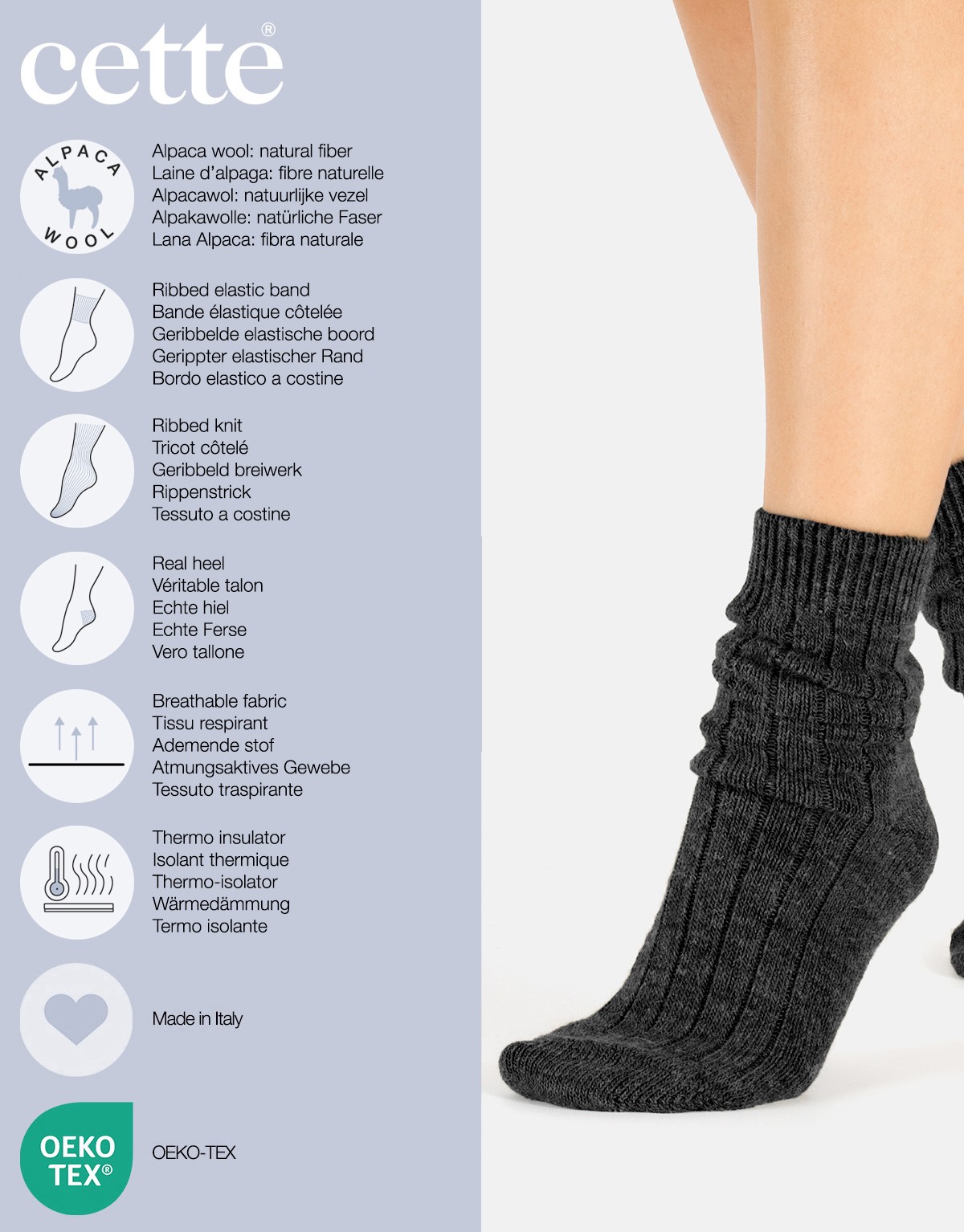 Chaussettes en laine d’alpaga côtelées avec bord confortable.