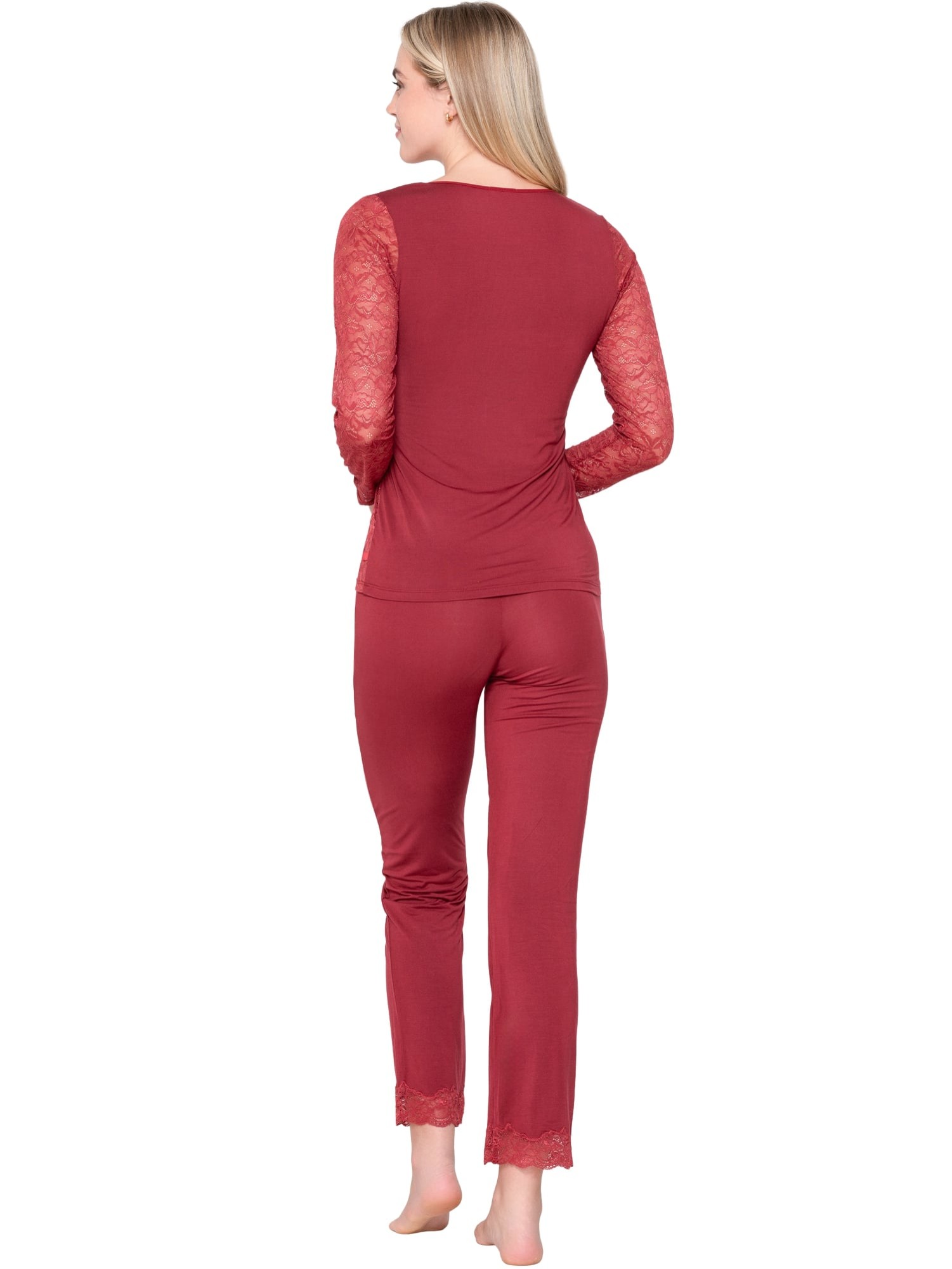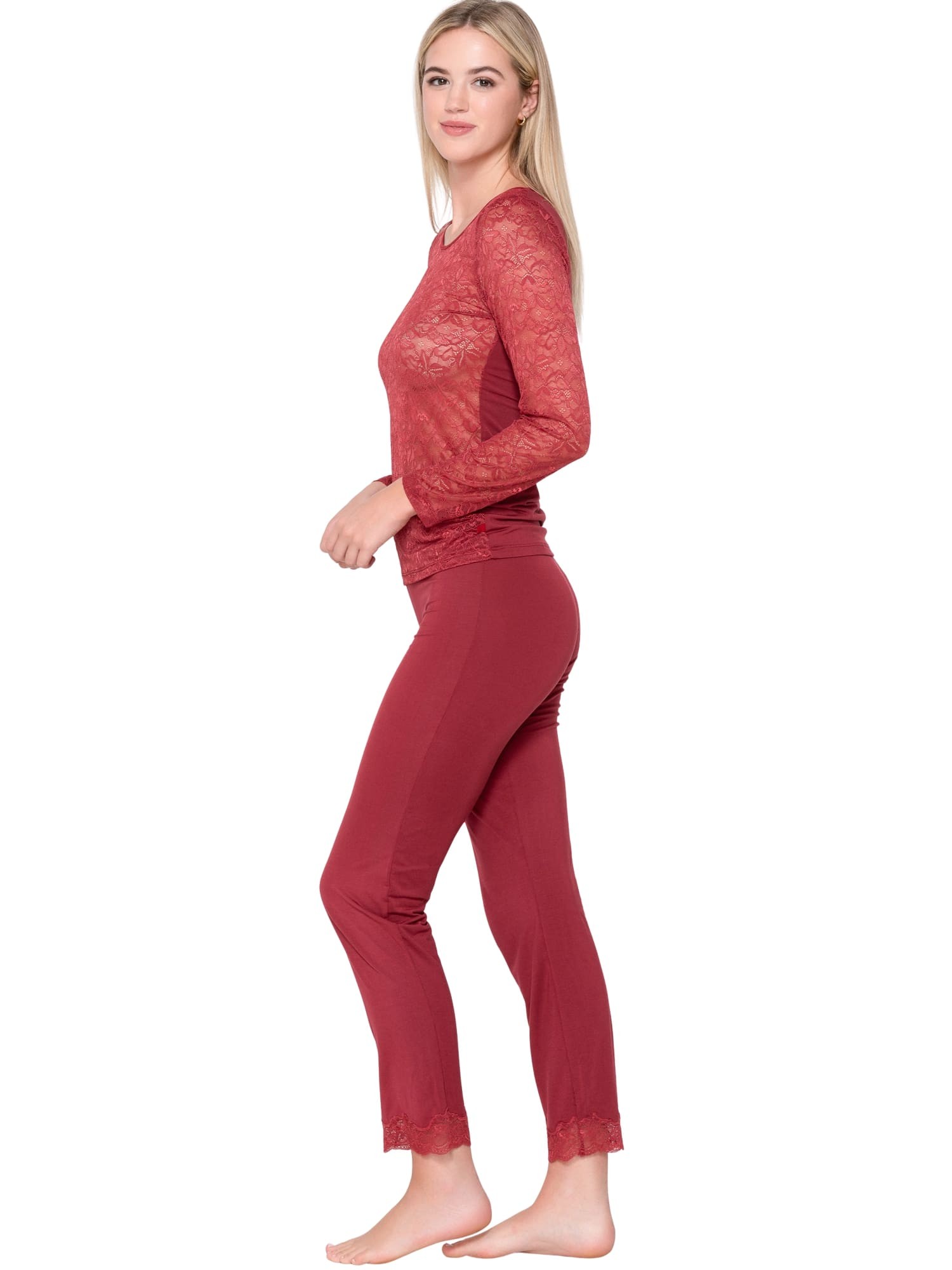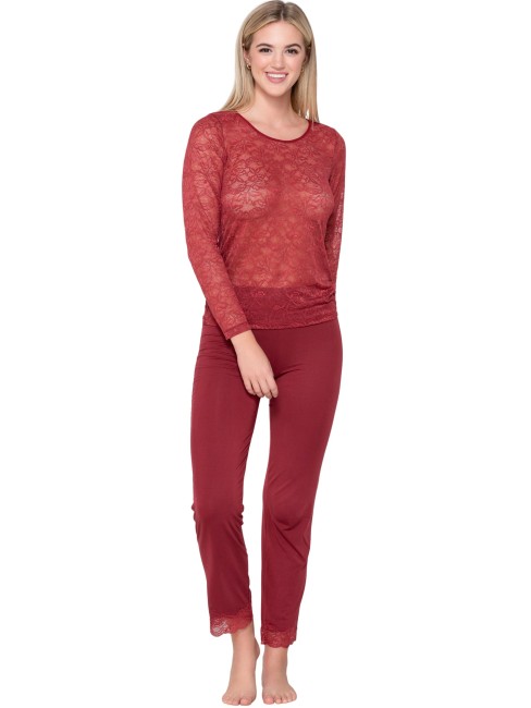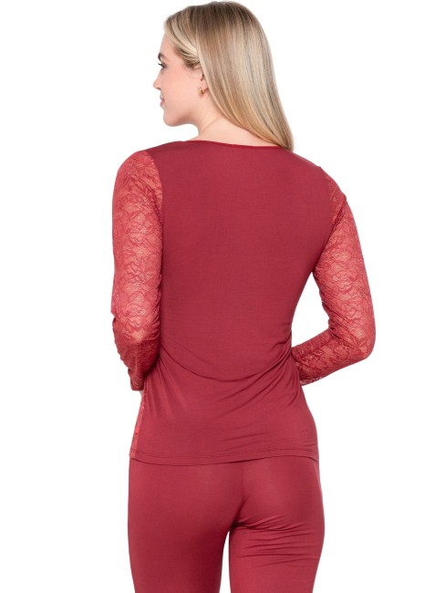 Caraco dans une coupe t-shirt à manches longues. L'avant et les manches sont sensuellement transparents, entièrement en dentelle délicate pour un look léger et très féminin. Le dos est en tissu micro modal ultra doux et agréable sur la peau, ce qui crée un contraste confortable.