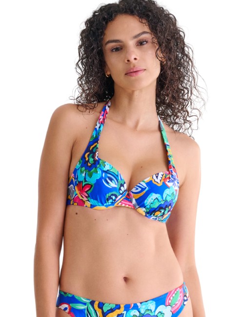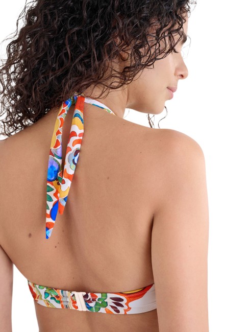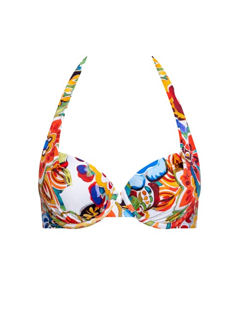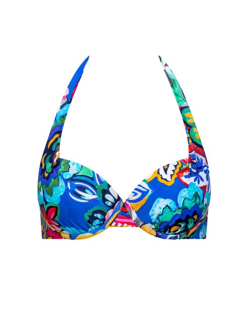 Soutien-gorge avec bonnets en mousse intégrés et armatures. Il offre un confort et un ajustement optimaux, même dans les grandes tailles. Bretelles larges et fermeture autour du cou, matière lisse imprimée d'un motif multicolore éclatant. Fermeture à boucle dans le dos.