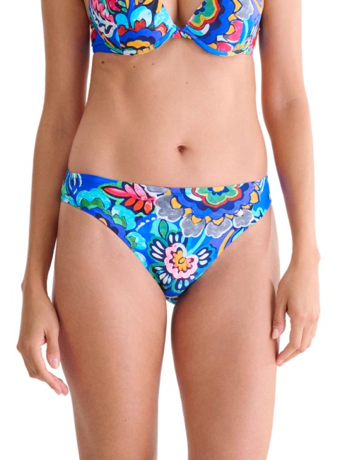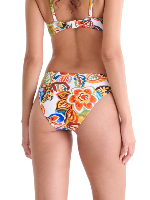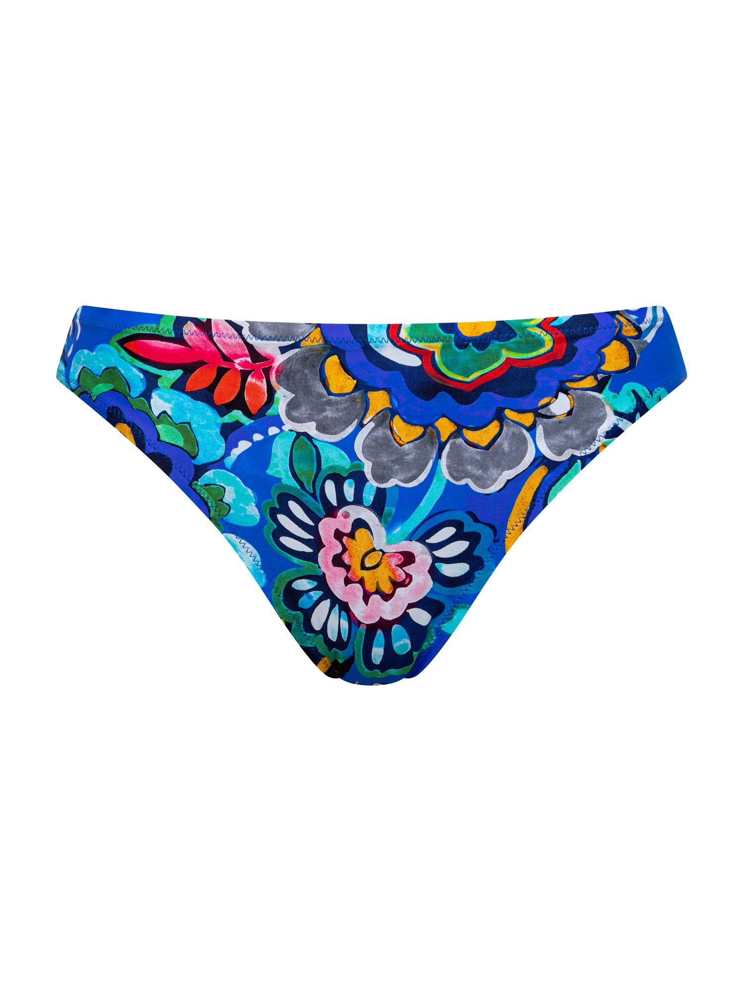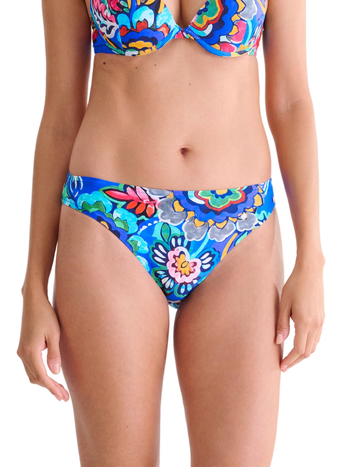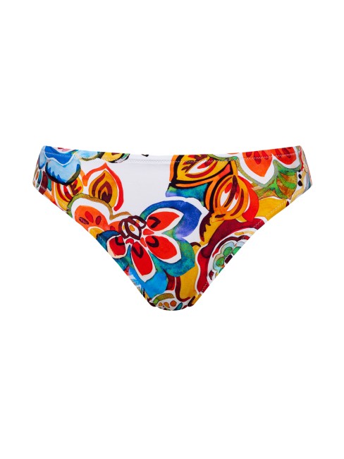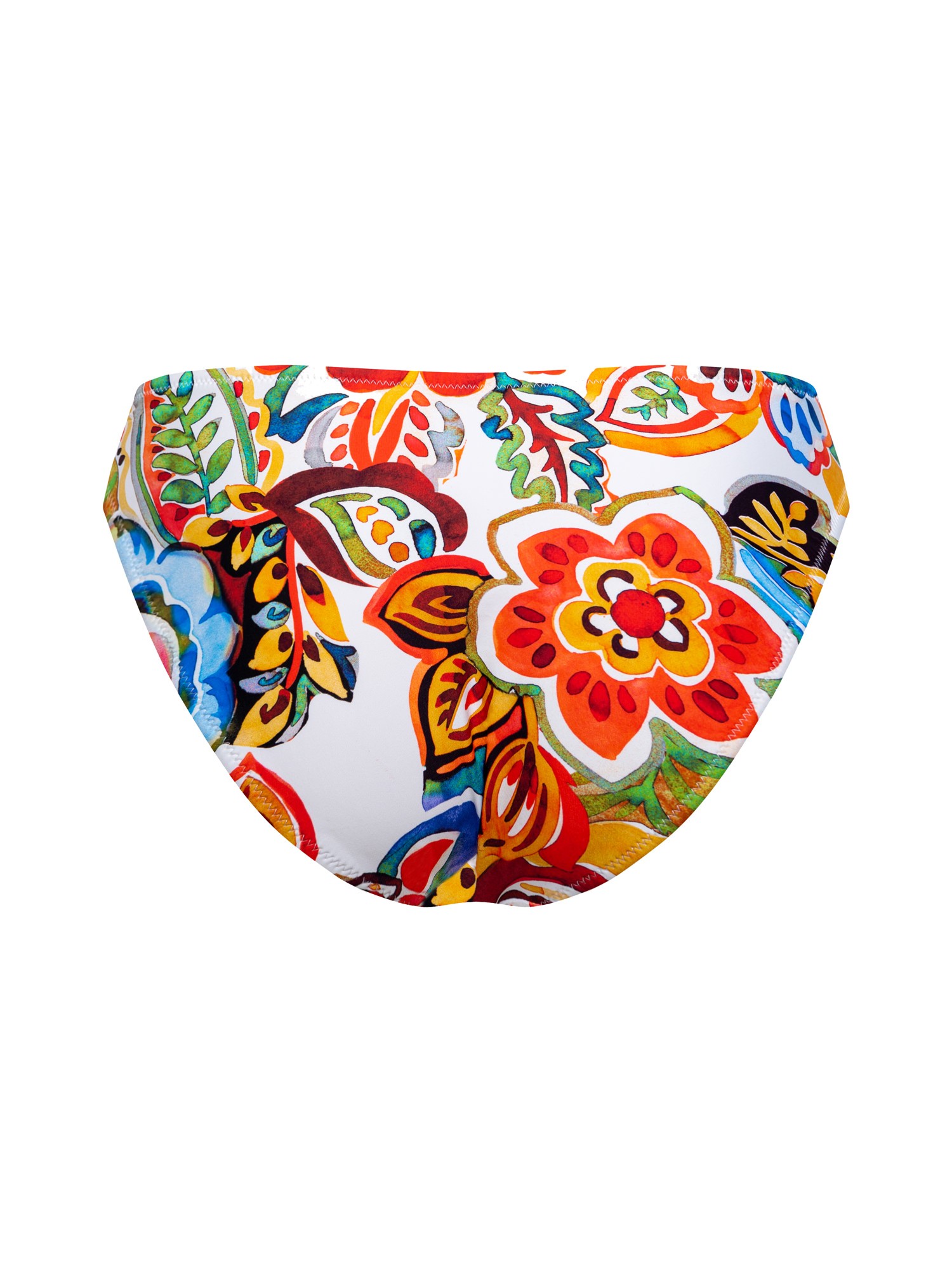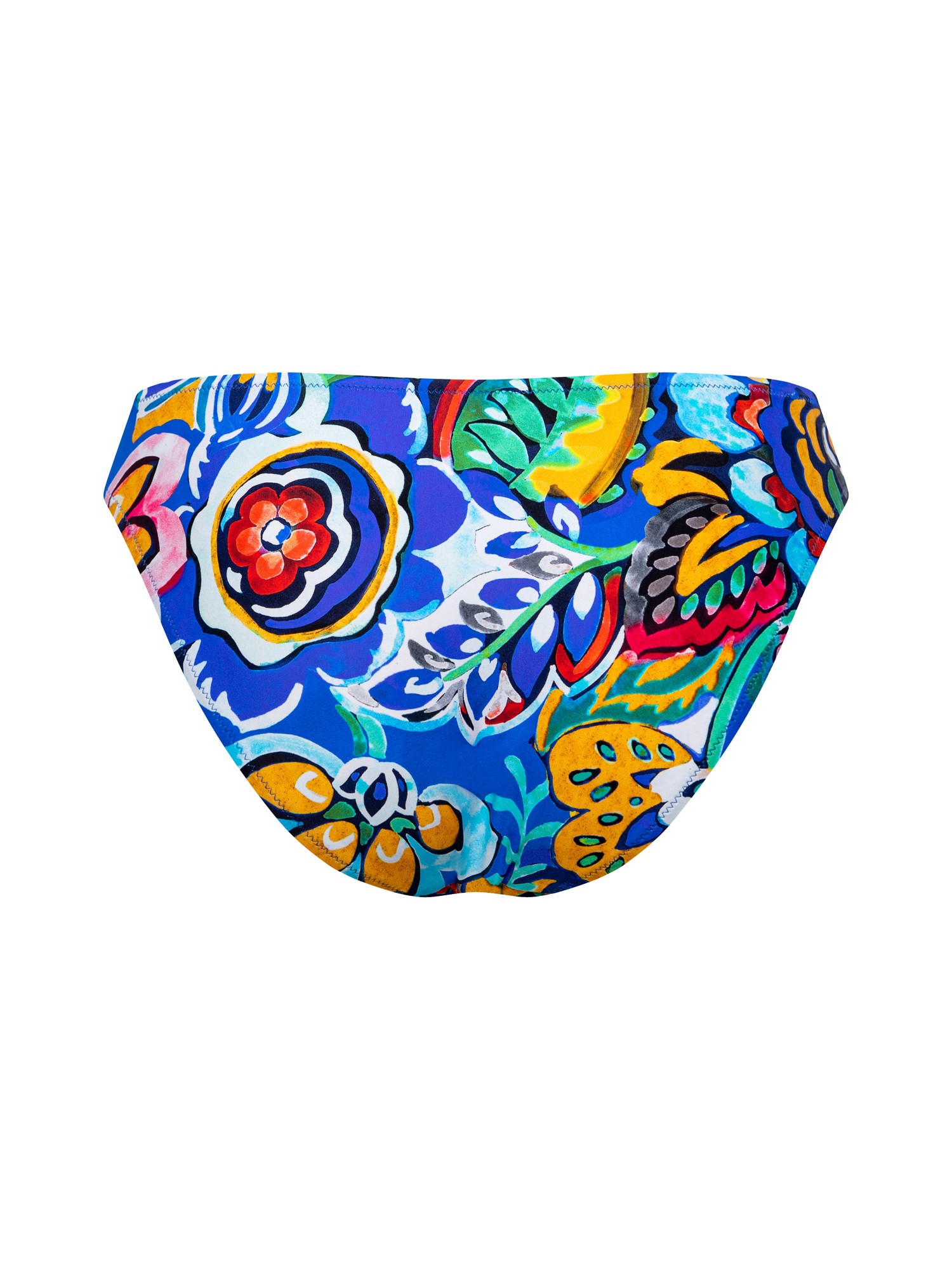 Slip léger à la coupe simple et classique, dans une matière lisse, imprimée d'un motif multicolore éclatant. Hauteur environ 24 cm. Le coloris rouge est doublé à l'avant et à l'arrière. Le coloris bleu est doublé uniquement à l'avant.