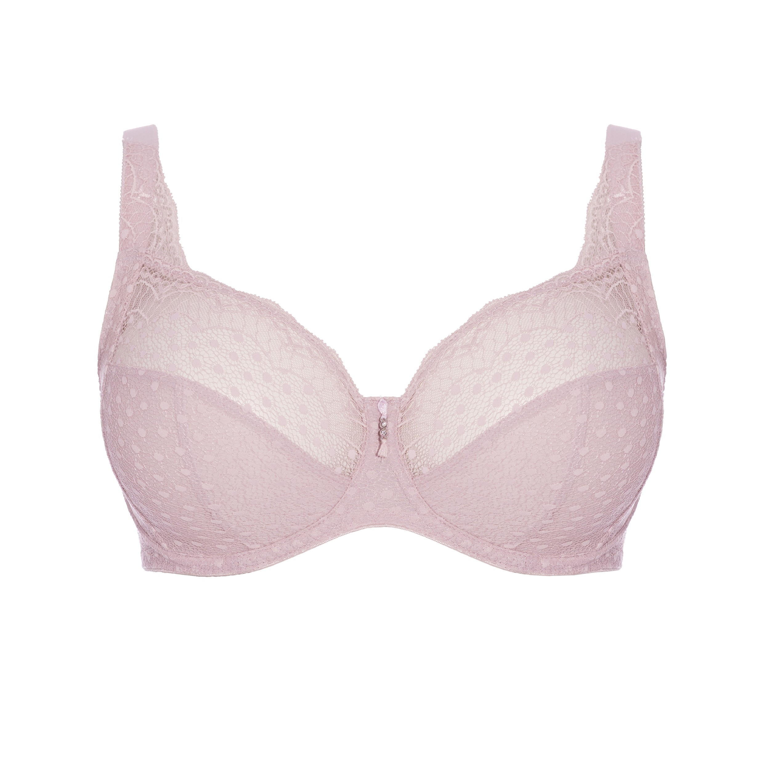 Soutien-gorge en dentelle à pois. La doublure intérieure est confectionnée dans une maille fine offrant maintien, transparence et légèreté. Bonnets trois sections ; à partir du bonnet E, une quatrième couture est intégrée au renfort sous la poitrine. Bretelles centrales confortables ornées de dentelle et élégant motif de strass sur le buste sublimant le décolleté.