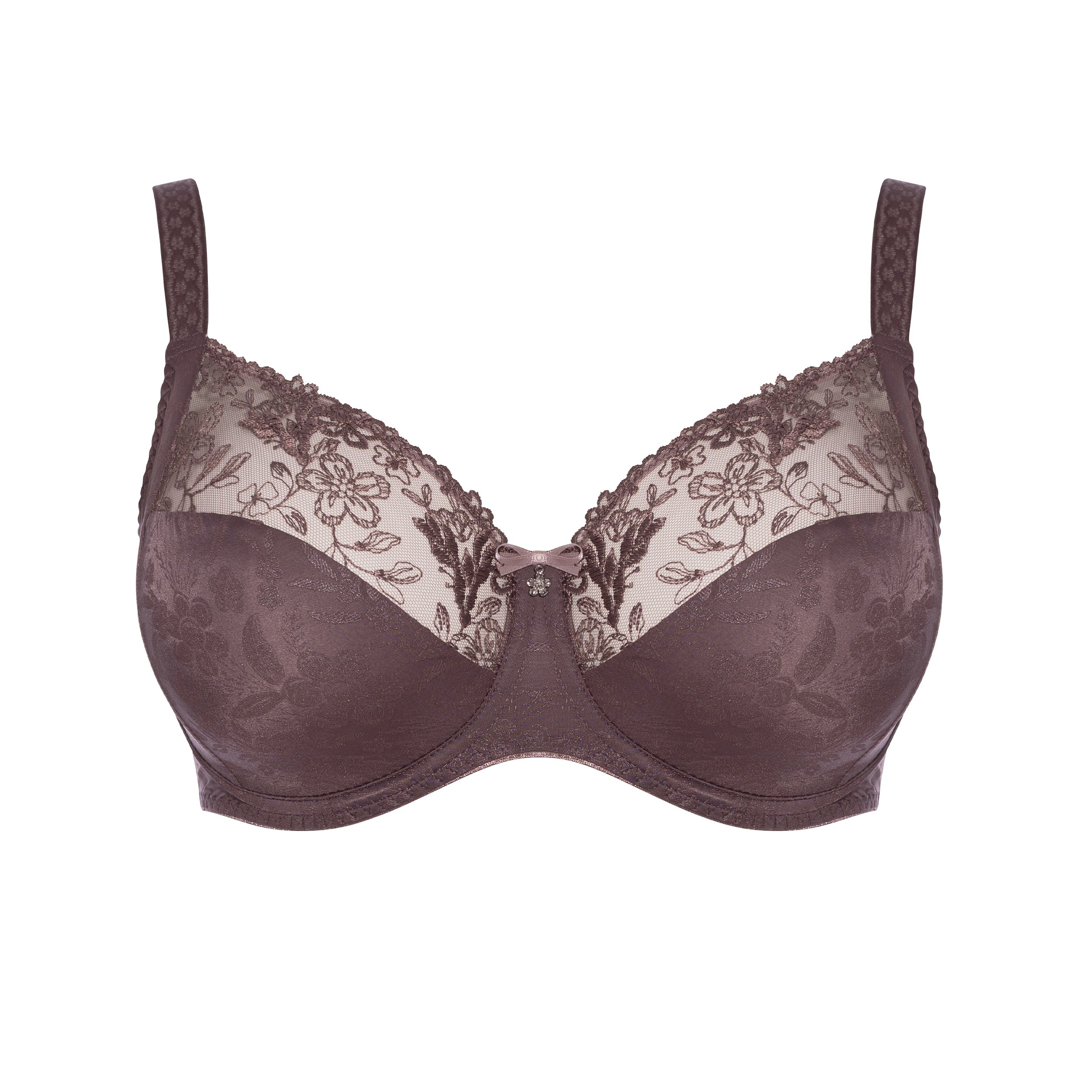 Le décolleté est orné d'une broderie calandrée plate et sans couture. Le dos est doublé de tulle ferme et élastique, assurant maintien et confort.