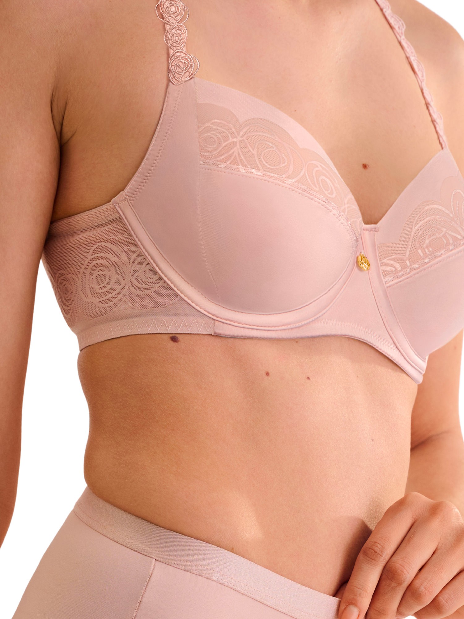 Ce soutien-gorge séduisant offre un confort et une élégance au quotidien. Son design est fonctionnel avec une partie centrale construite d'un seul tenant. Bonnets préformés agréables dont l'intérieur est velouté et doux au toucher. Ils sont lisses à l'extérieur pour un look impeccable sous les vêtements. Les côtés ainsi que le haut des bonnets sont ornés d'une dentelle transparente finement brodée de motifs floraux, ajoutant une touche de féminité et de sophistication. Dans les grandes tailles, le dos est doublé de tulle élastique pour un meilleur enveloppement et un meilleur confort. Les bretelles sont finement décorées de broderies florales pour encore plus de féminité. Elles sont réglables pour un ajustement parfait. Petit bijou décoratif entre les bonnets pour une finition élégante. Un modèle qui allie confort et esthétique, à la fois pratique pour le quotidien et suffisamment chic pour se sentir séduisante en lingerie.