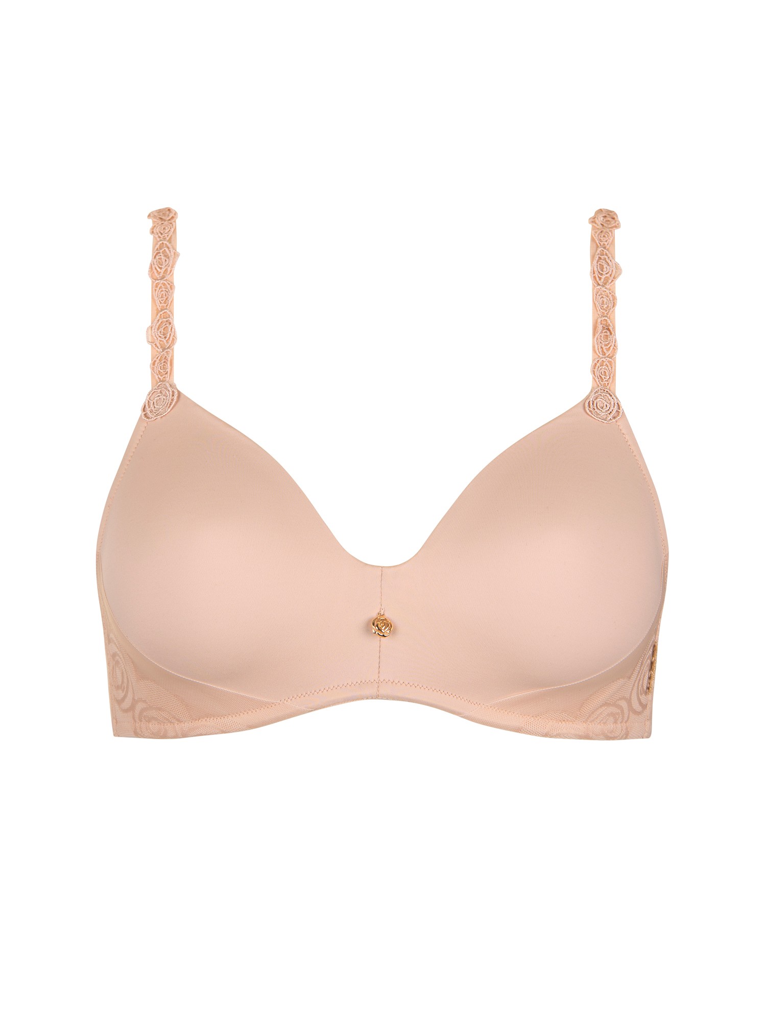 Soutien-gorge sans armatures, confortable et moderne, qui vous offrira un confort quotidien. Bonnets préformés agréables dont l'intérieur est velouté et doux au toucher. Ils sont lisses à l'extérieur pour un look impeccable sous les vêtements. Maille coton confortable et douce associée à des empiècements en dentelle transparente qui ornent les côtés et le dos, finement brodée de motifs floraux, ajoutant une touche de féminité et de sophistication. Les bretelles sont finement décorées de broderies florales pour encore plus de féminité. Elles sont réglables pour un ajustement parfait. Petit bijou décoratif entre les bonnets pour une finition élégante.