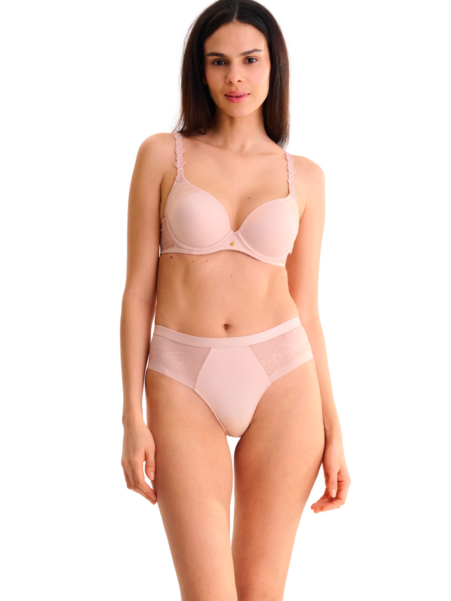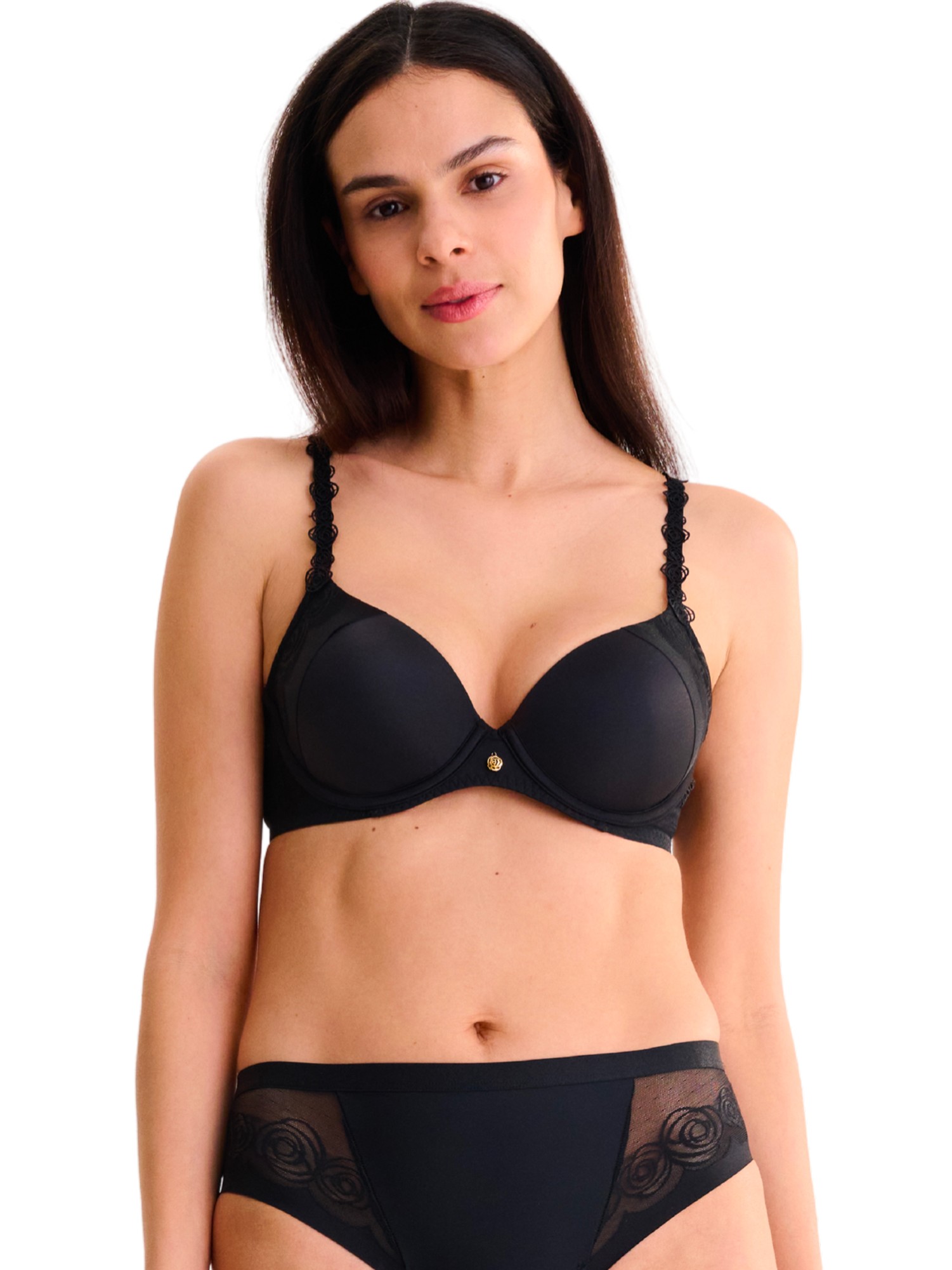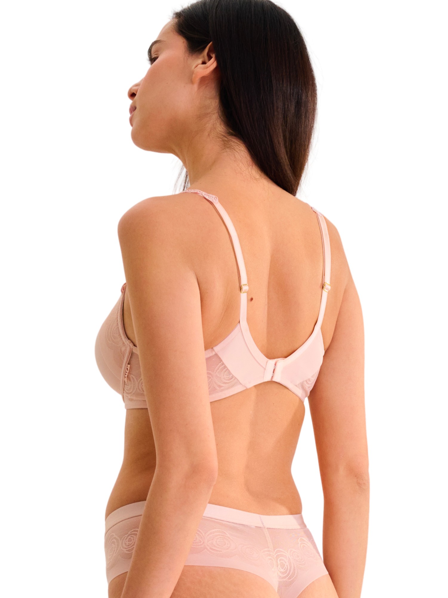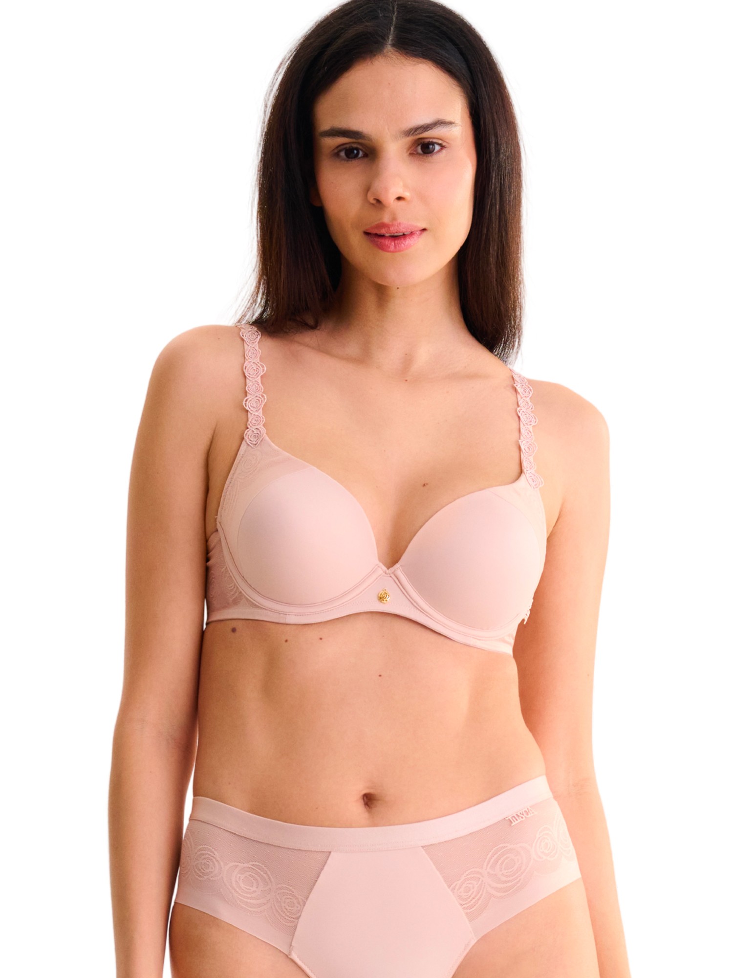 Ce soutien-gorge séduisant offre un confort et une élégance au quotidien. Son design est fonctionnel avec une partie centrale construite d'un seul tenant. Bonnets préformés agréables dont l'intérieur est velouté et doux au toucher. Ils sont lisses à l'extérieur pour un look impeccable sous les vêtements. Les côtés ainsi que le haut des bonnets sont ornés d'une dentelle transparente finement brodée de motifs floraux, ajoutant une touche de féminité et de sophistication. Dans les grandes tailles, le dos est doublé de tulle élastique pour un meilleur enveloppement et un meilleur confort. Les bretelles sont finement décorées de broderies florales pour encore plus de féminité. Elles sont réglables pour un ajustement parfait. Petit bijou décoratif entre les bonnets pour une finition élégante. Un modèle qui allie confort et esthétique, à la fois pratique pour le quotidien et suffisamment chic pour se sentir séduisante en lingerie.