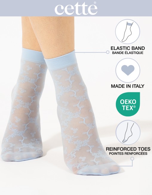 Ces chaussettes transparentes florales sont fabriquées en Italie et sont certifiées Oeko-Tex.
