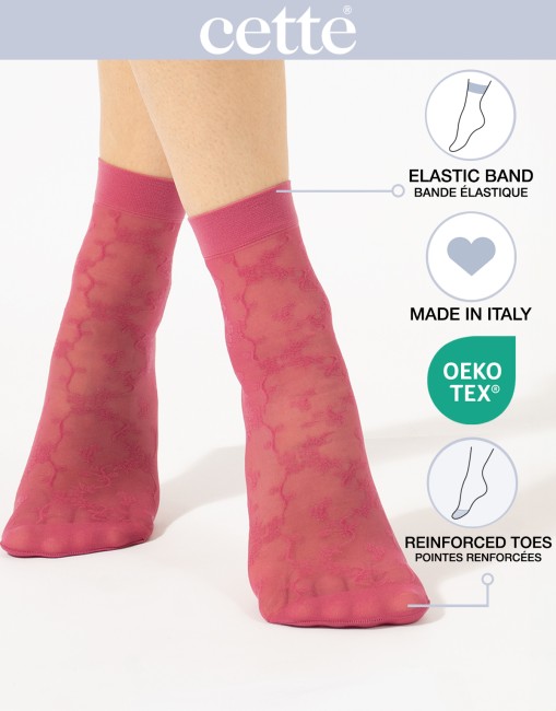 Ces chaussettes transparentes florales sont fabriquées en Italie et sont certifiées Oeko-Tex.
