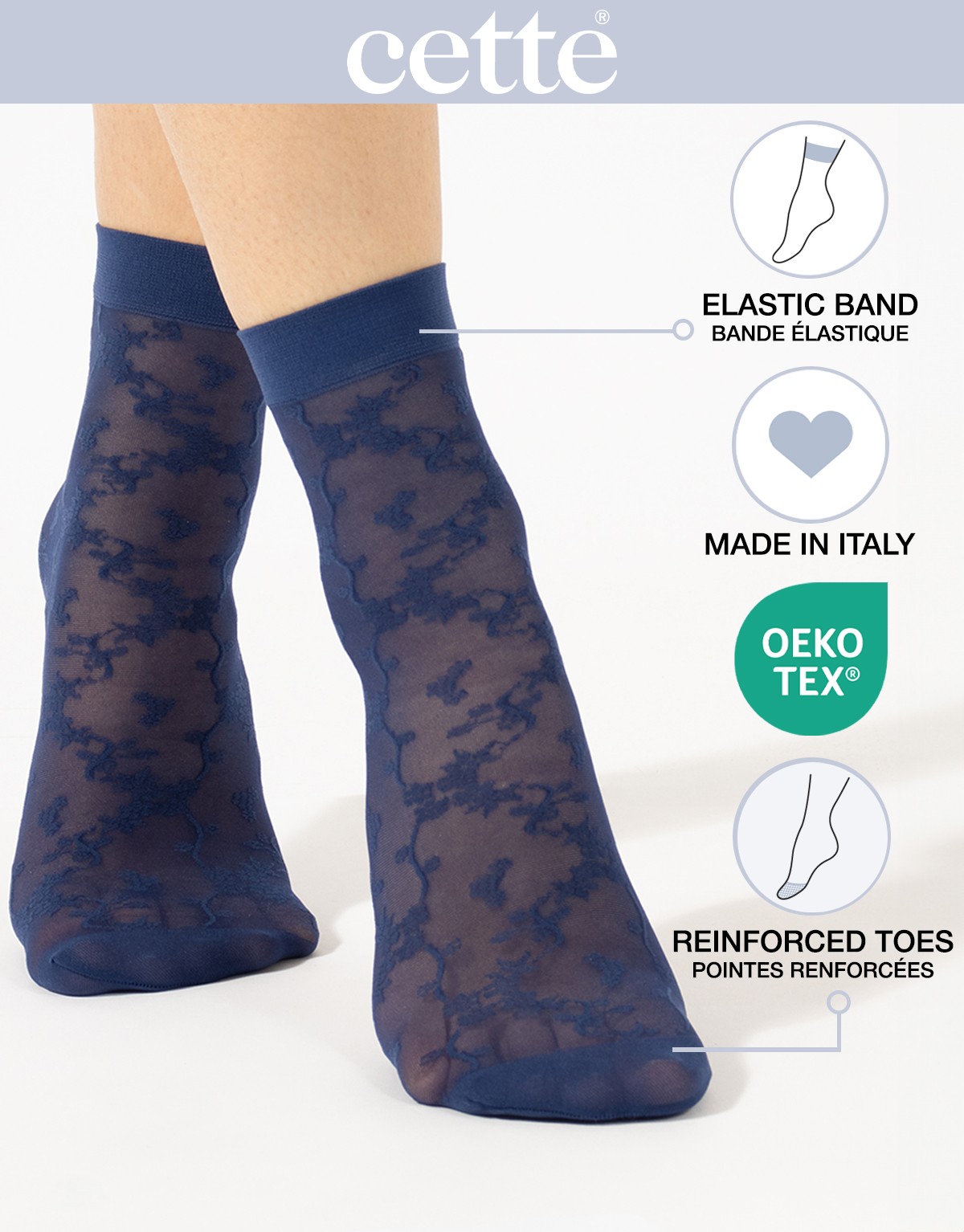 Ces chaussettes transparentes florales sont fabriquées en Italie et sont certifiées Oeko-Tex.